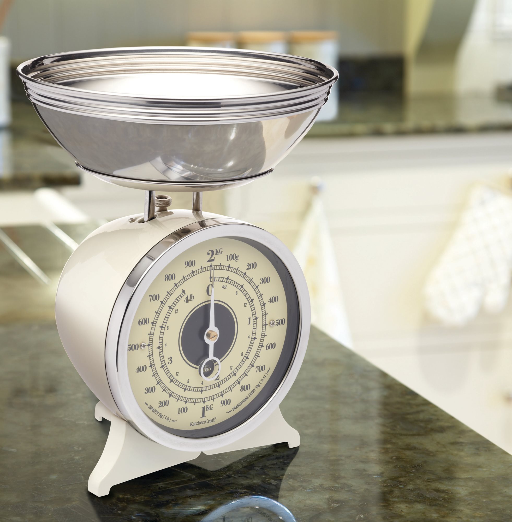 Винтидж изглеждаща кухненска везна , изработена от Kitchen Craft. Контейнерът за претегляне е изработен от неръждаема стомана, а защитният капак и основата на везната са изработени от твърд метал.