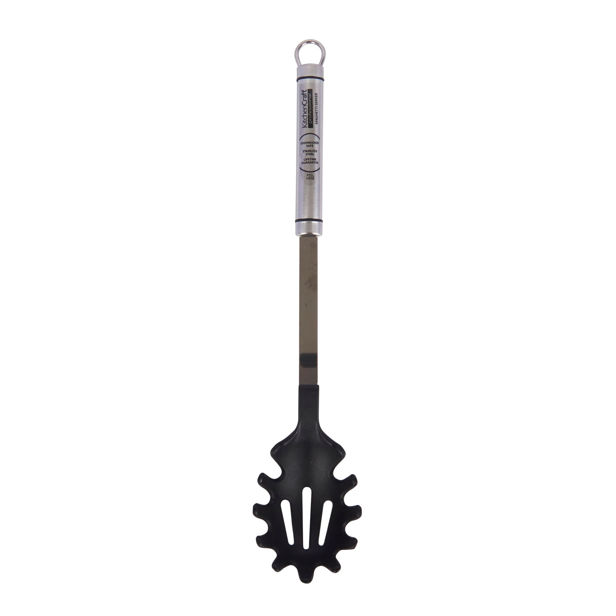 Лъжица за макаронени изделия, марка Kitchen Craft, изработена от топлоустойчива пластмаса до 210°C (найлон), с дръжка от неръждаема стомана.