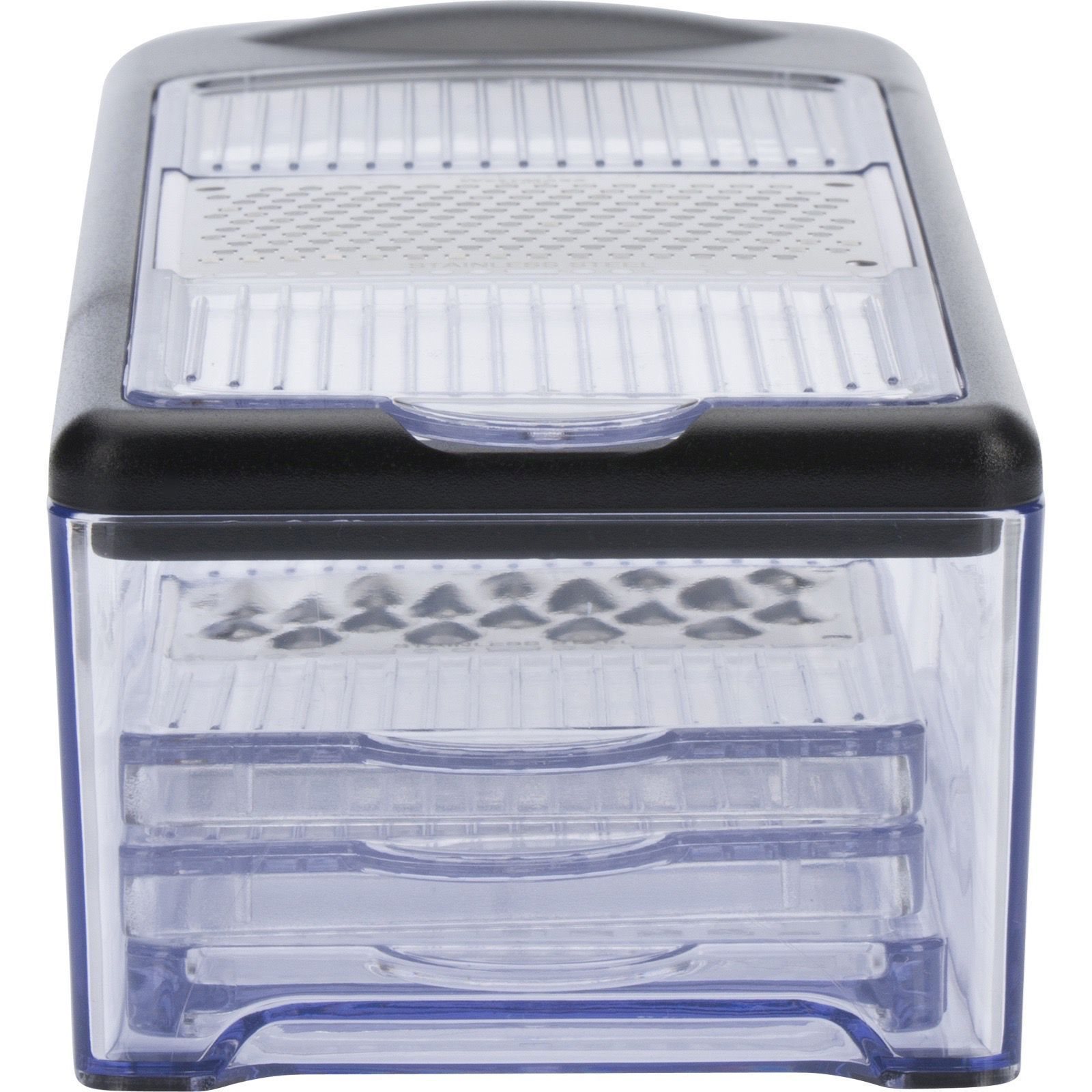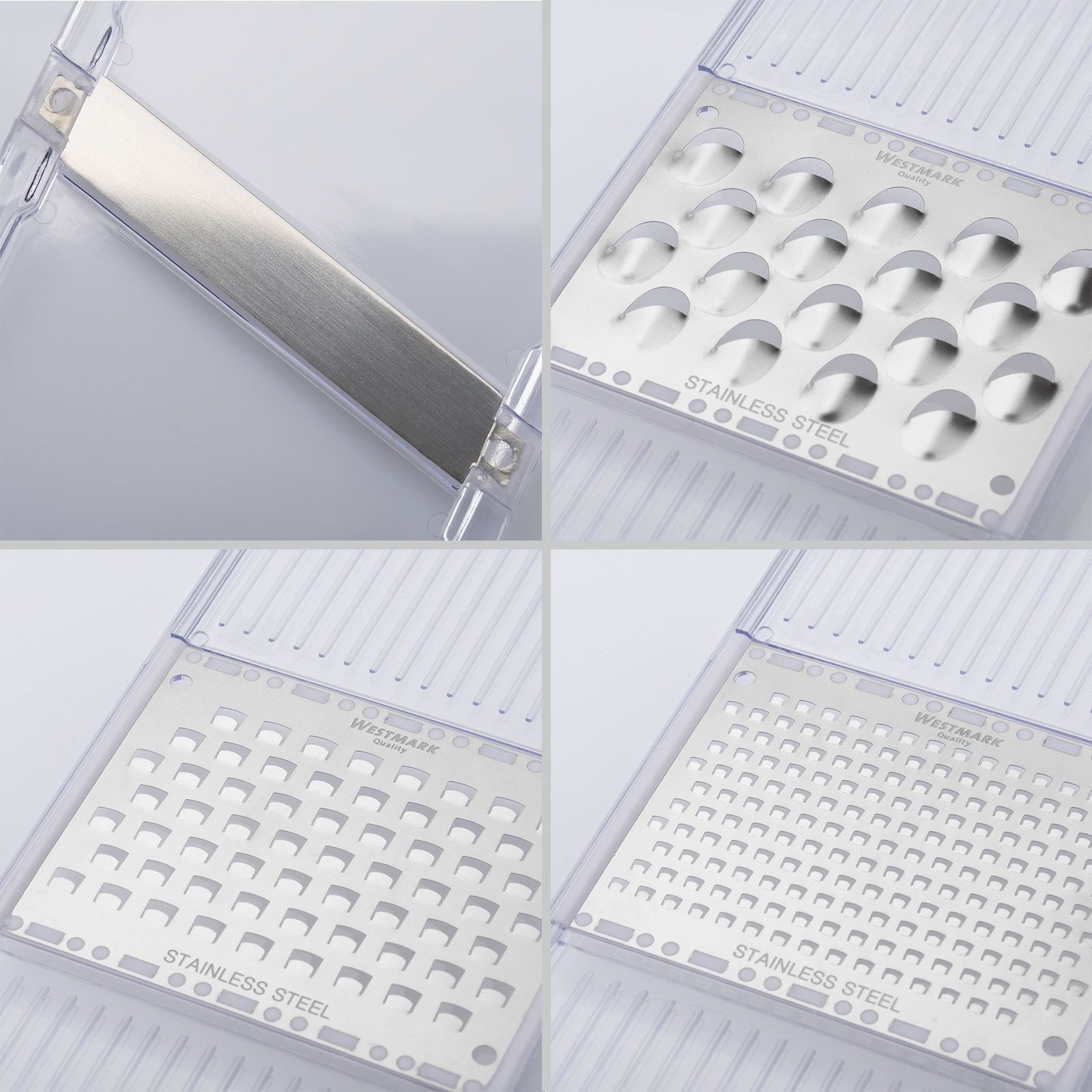 Разполага с 4 различни рендета, изработени от неръждаема стомана - за едро остъргване, средно остъргване, фино остъргване и нарязване (краставици, моркови, картофи) и прозрачна колекционерна чиния, изработена от пластмаса.