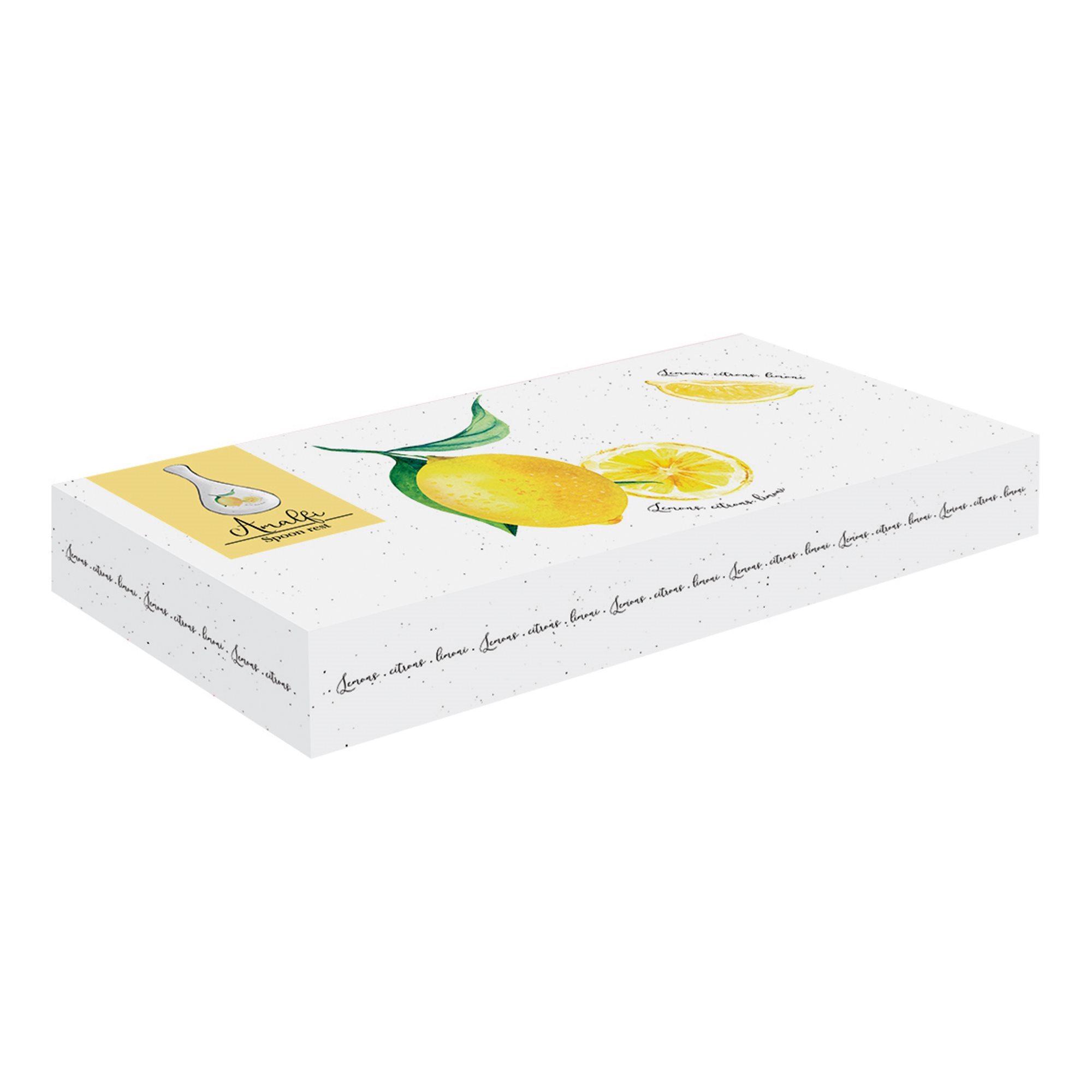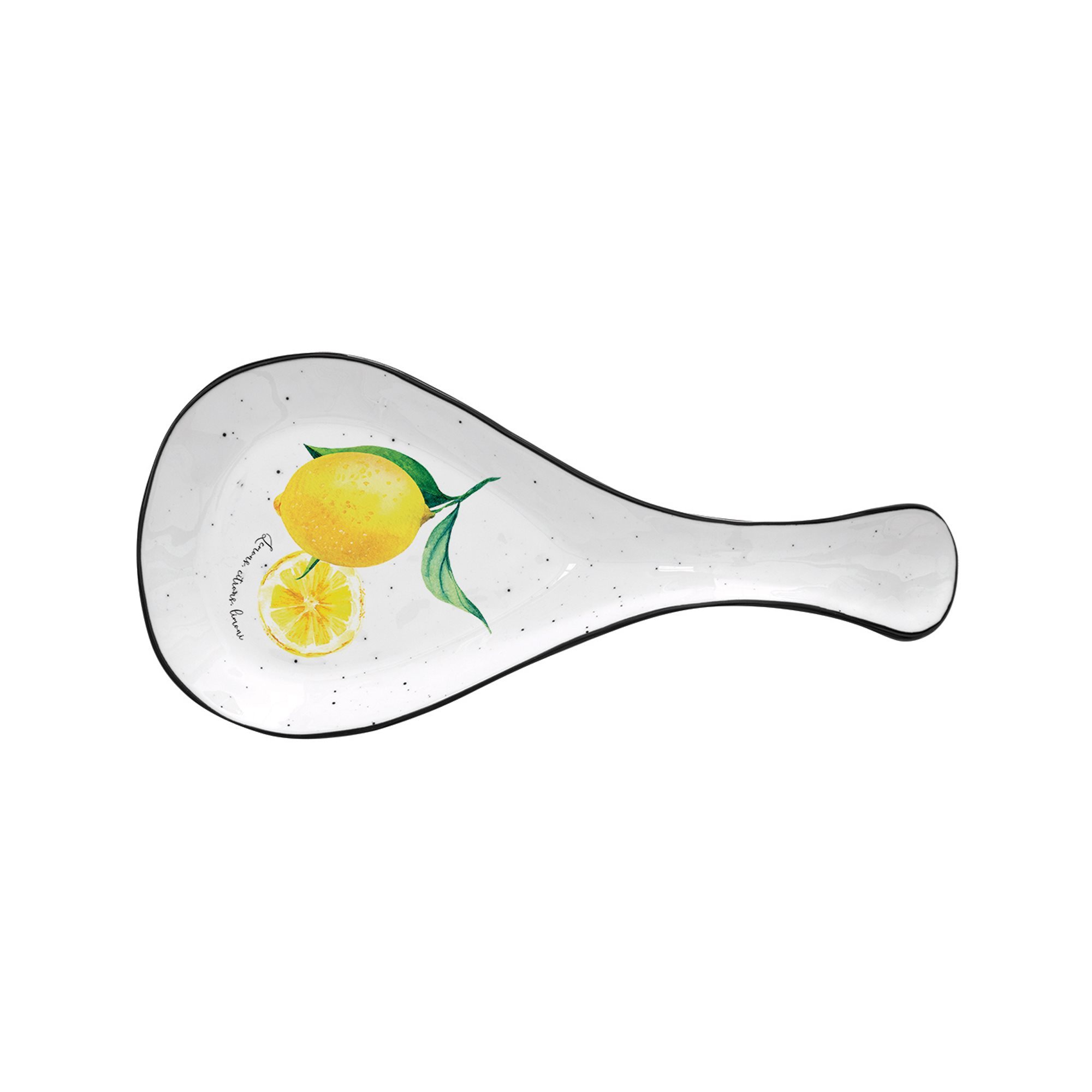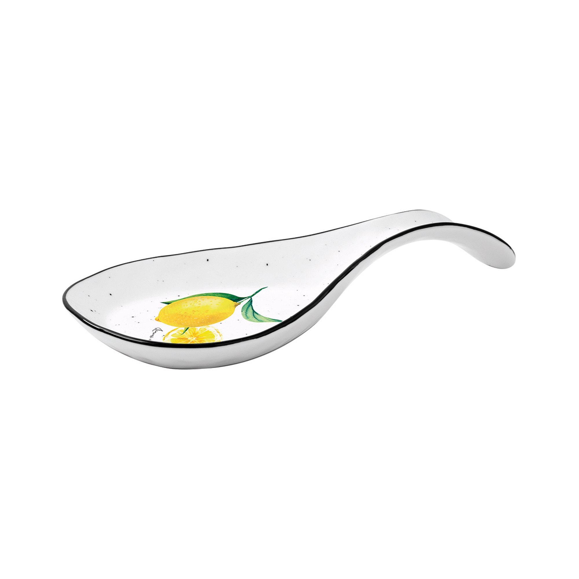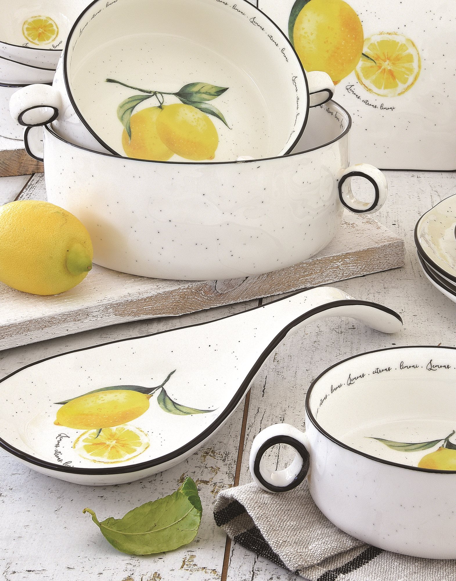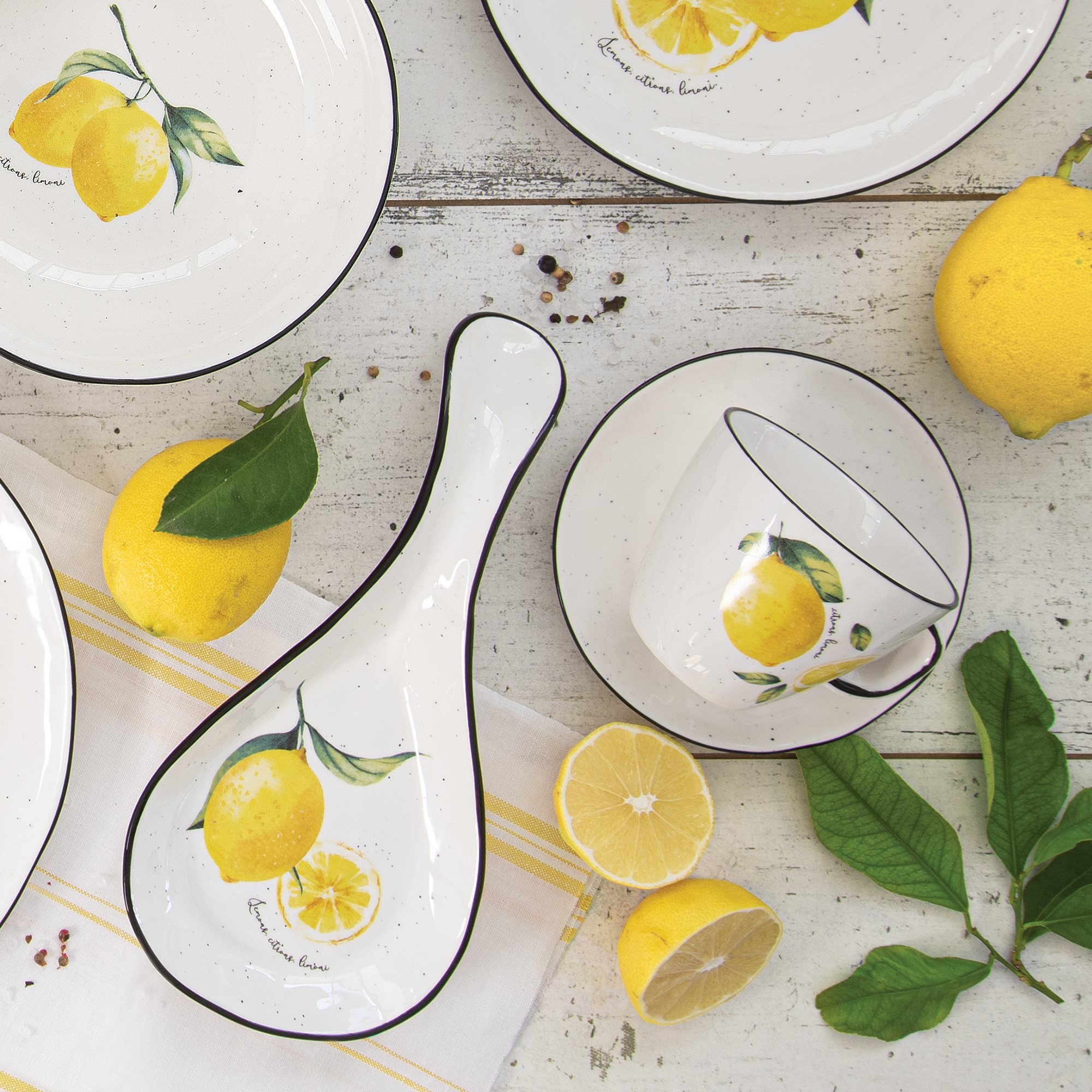 Поставката "Amalfi" от бял порцелан е украсена със сочния лимонов плод и има ръчно нарисуван ръб в карбонов цвят.