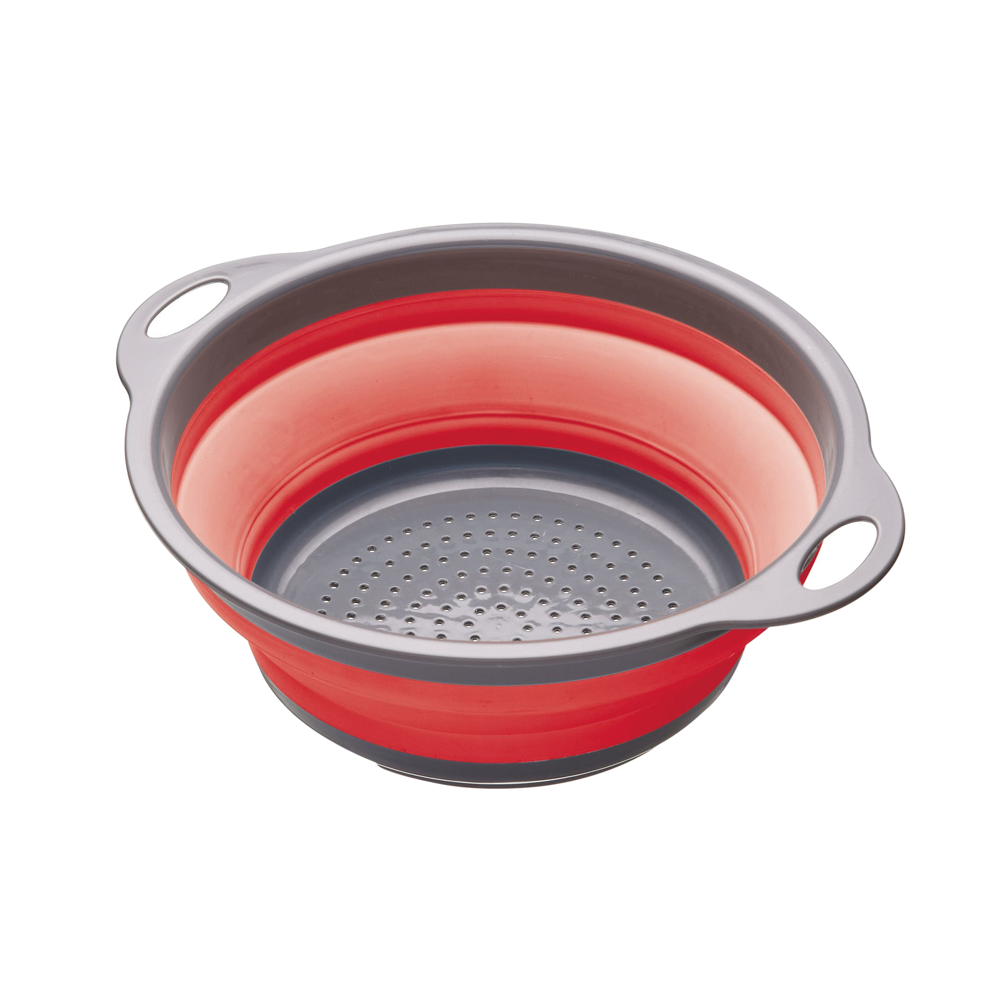 Сгъваема цедка от Kitchen Craft, диаметър 24 см, изработена от червен силикон , който е топлоустойчив до 260°C, с дръжки и сиво сито.