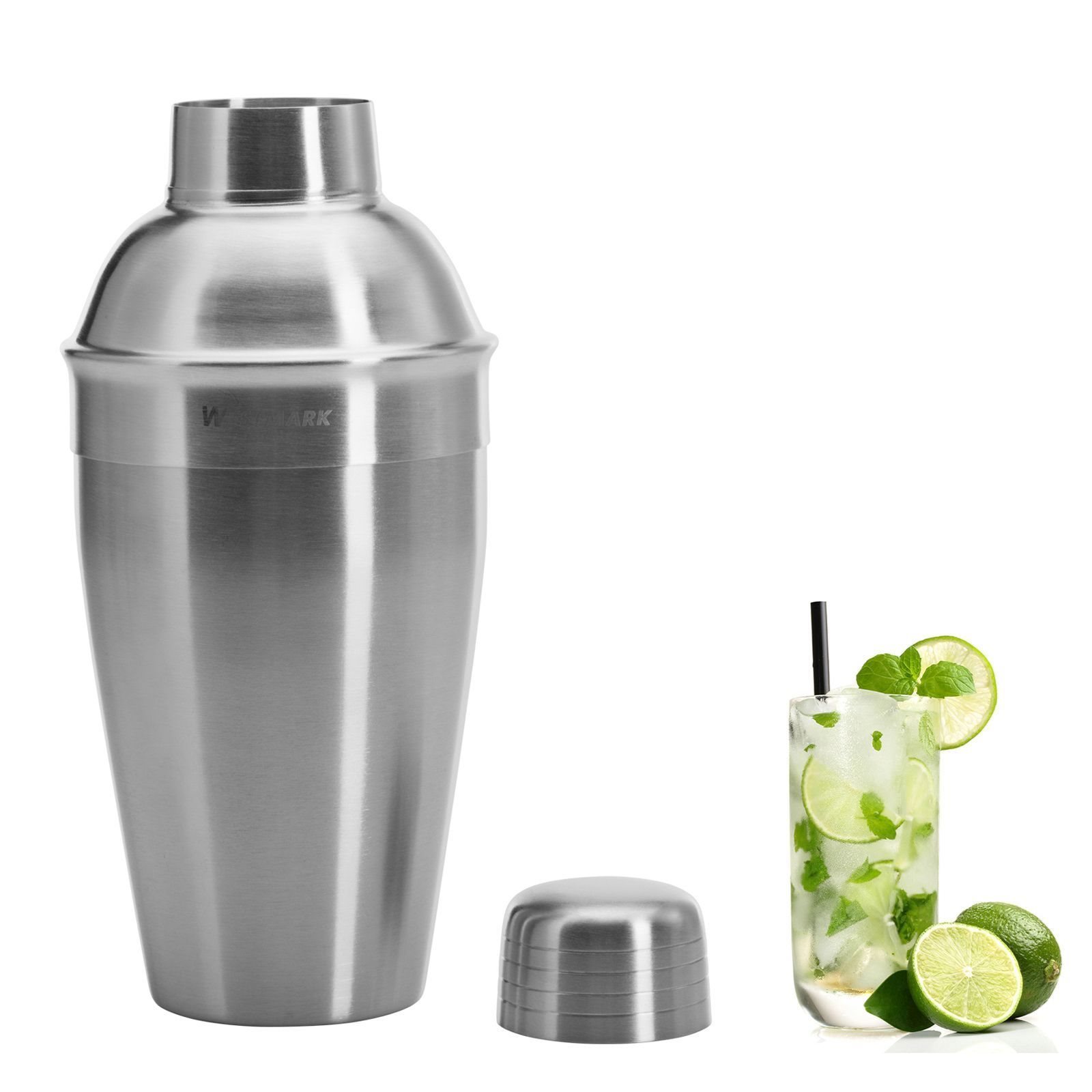 Shaker от неръждаема стомана, произведен от Westmark, размери 205 x Ø 90 мм, вместимост 0,5 литра, с подвижен капак и сито за задържане на парчета плодове или кубчета лед.