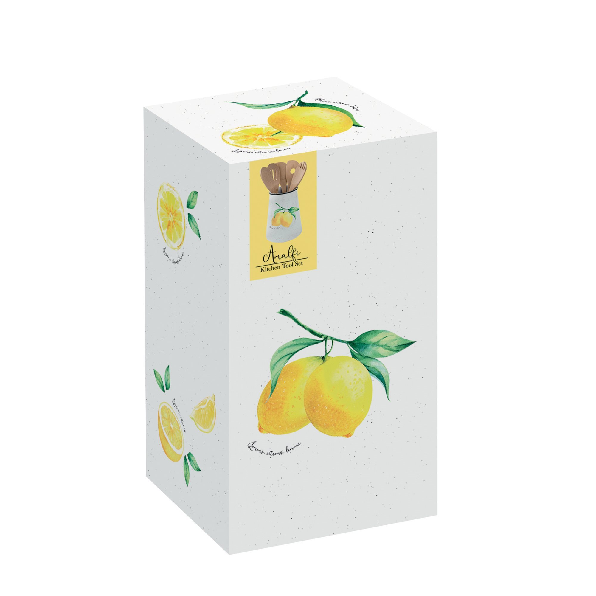 Декориран с добре познатия лимонов плод, държачът има ръб с карбонов цвят, нарисуван на ръка.