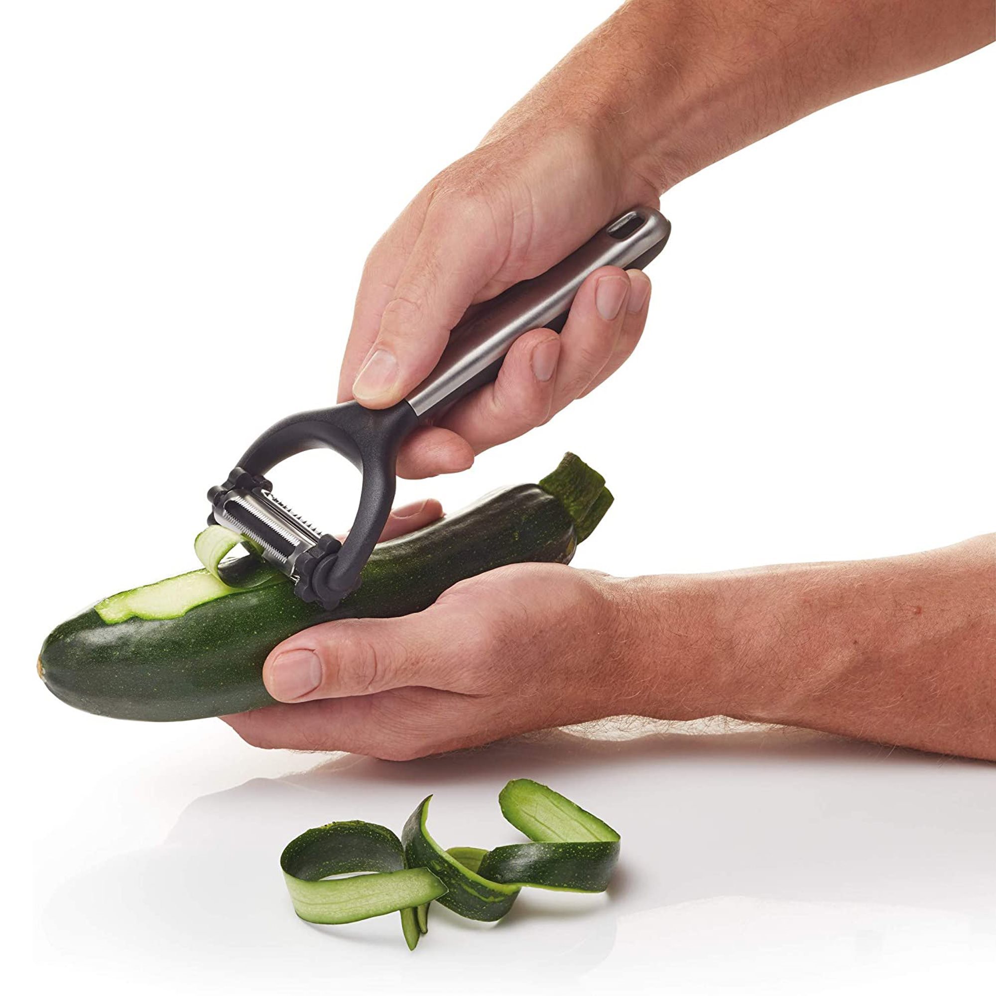 С правилното острие можете да създадете зеленчукови и тиквени спагети или просто можете да отлепите плода. Назъбеното острие прави цитрусовите плодове или зеленчуците с меко пилинг, като домати, да се обелват бързо и лесно. Използвайте острието julienne, за да накълцате морковите и цвеклото за салати или да създадете юлиенски ленти като декоративни елементи. Всяко острие ще премахне само горния слой, за да не загуби голяма част от пулпата от зеленчуци или плодове.