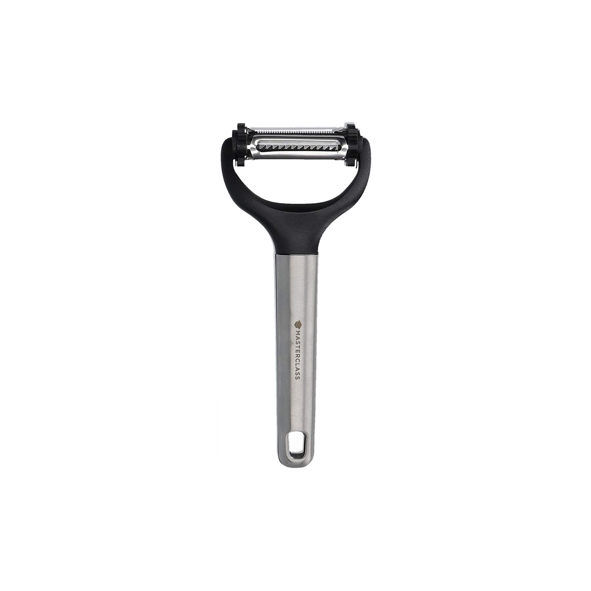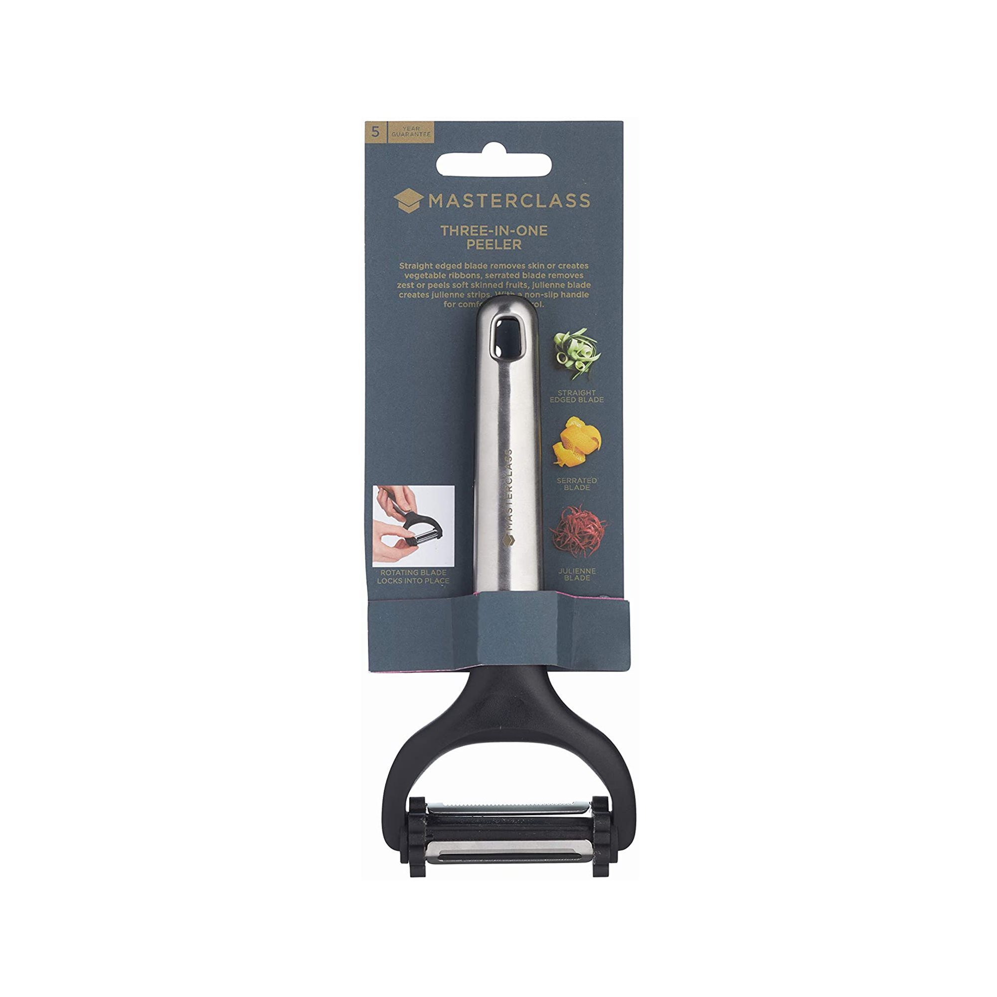 3-в-1 Пилинг от майсторски клас с въртящо се острие, изработено от неръждаема стомана, марка Kitchen Craft. Въртящото се острие ви позволява лесно да превключвате между остриетата с прави, назъбени и джулиенови ръбове с прост обрат. Всяко острие е фиксирано в безопасно положение за лесна работа.