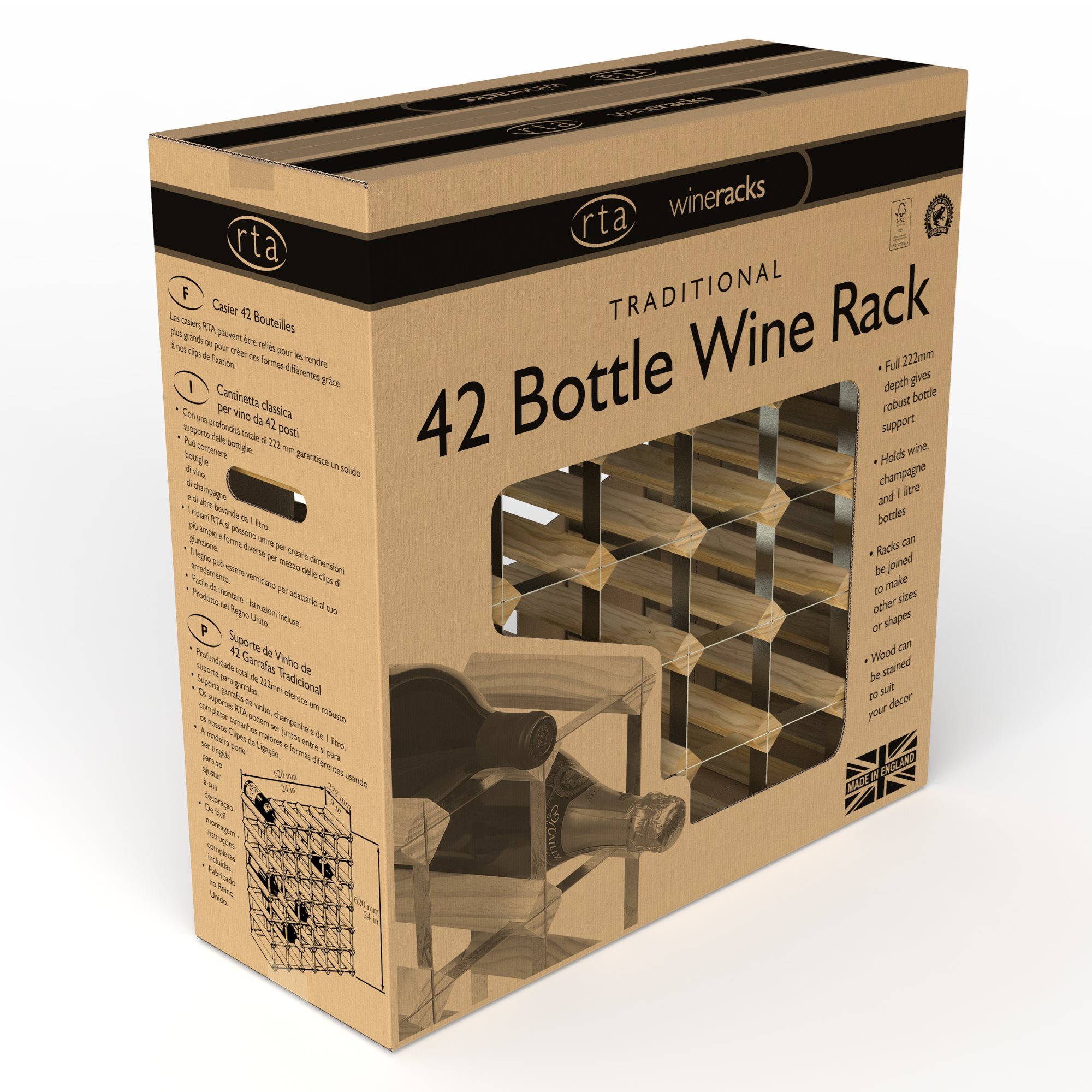 Поставка за 42 бутилки вино, изработена от борова дървесина, цвят Light Oak , марка RTA с размери 62 x 23 x 62 см. когато е сглобен.