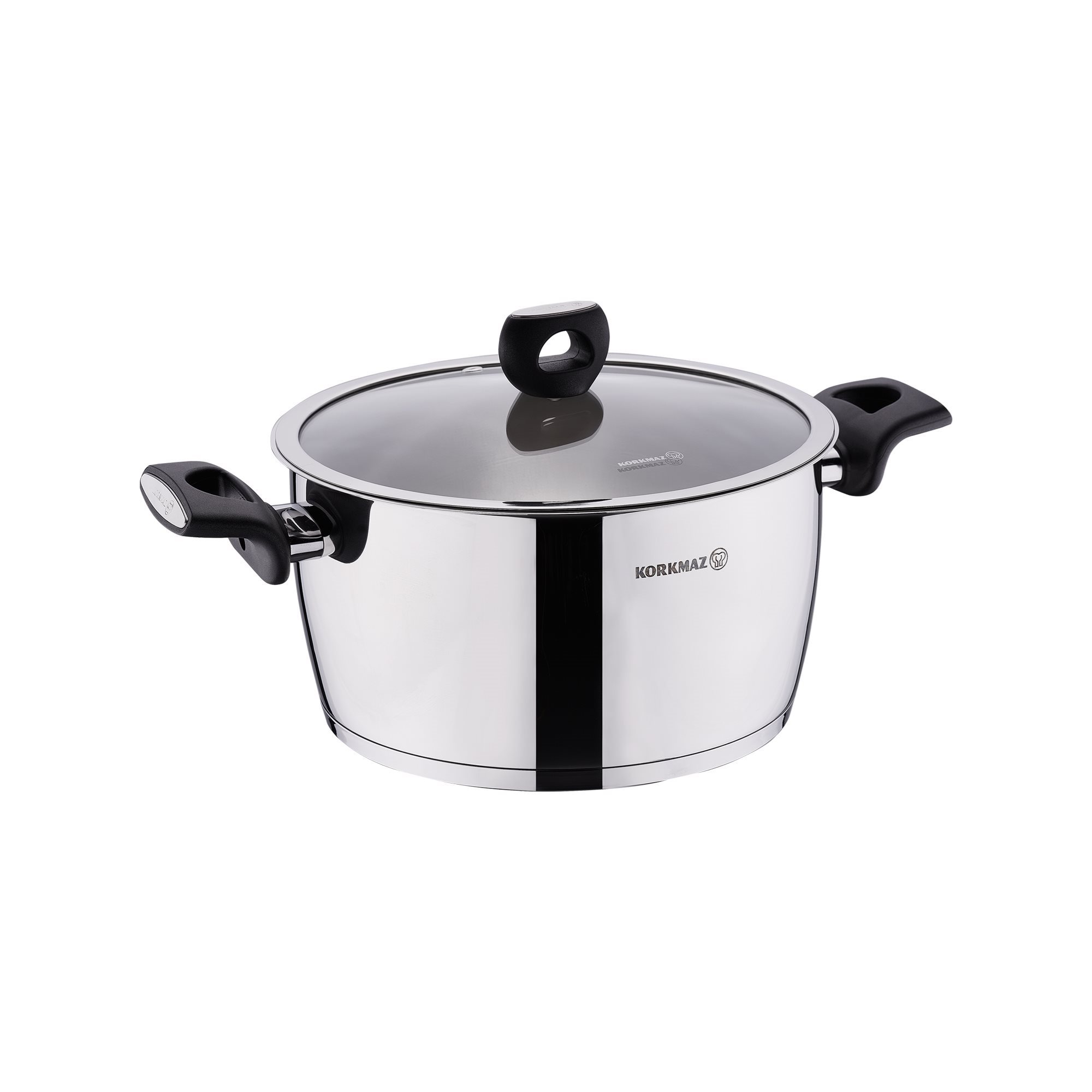 Тенджера с термоустойчив стъклен капак, диаметър 20 см, вместимост 3,5 л, изработена от неръждаема стомана 18/10 Cr-Ni (хром-никел), марка Korkmaz