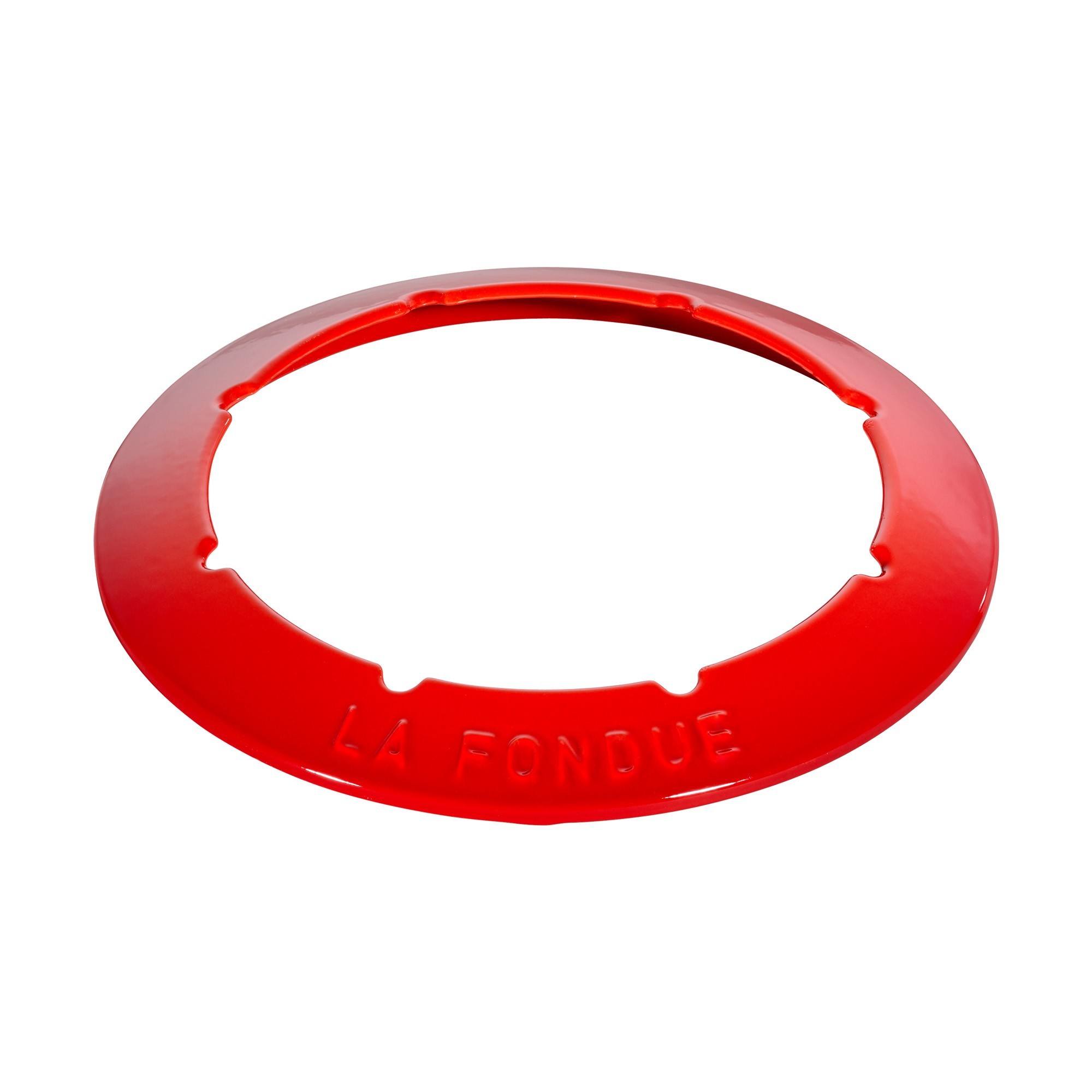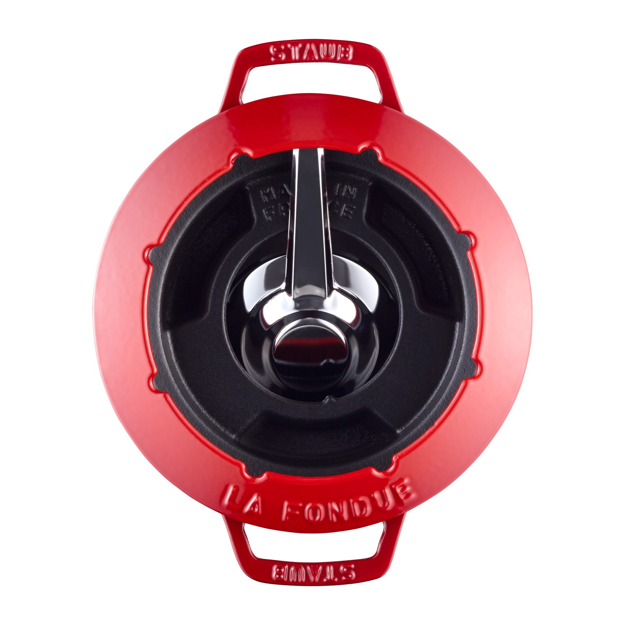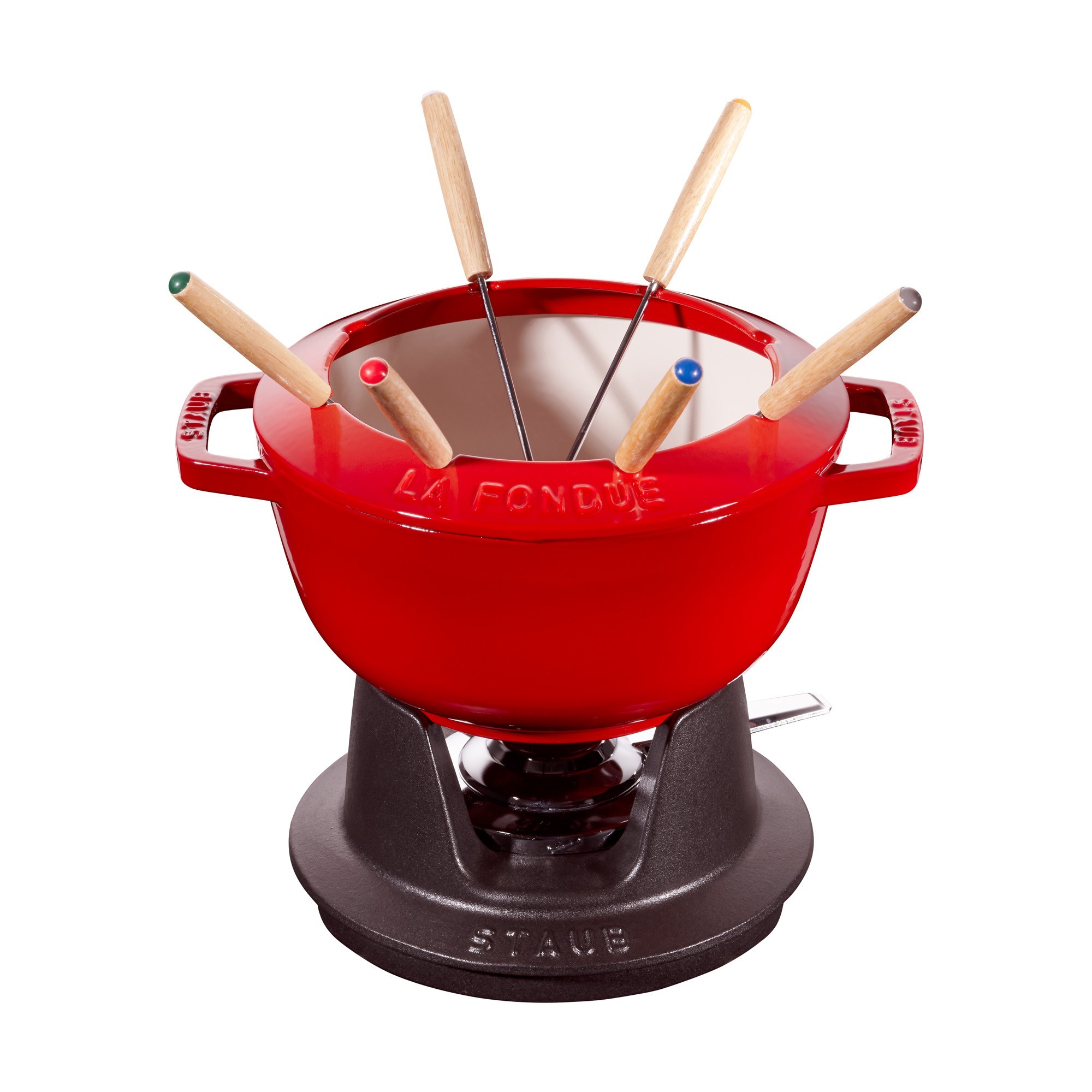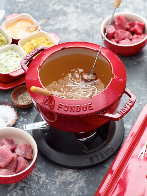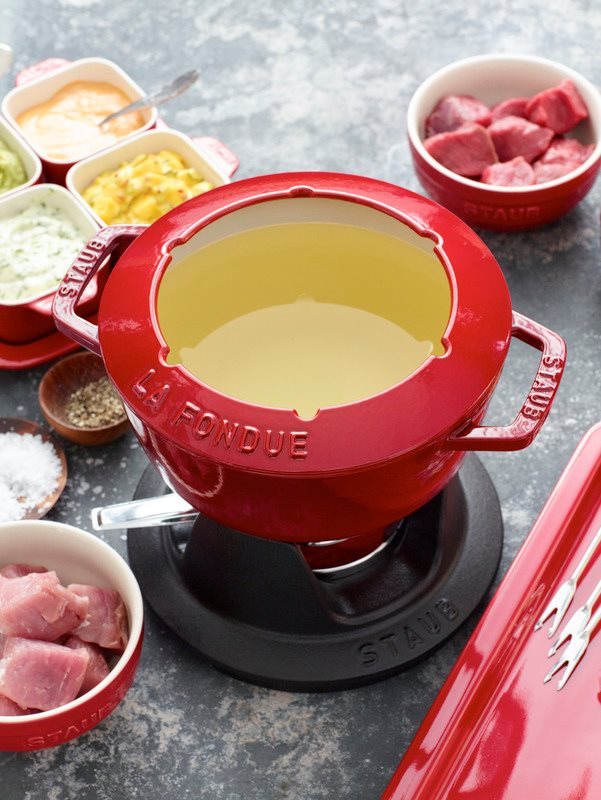 - купа за готвене на фондю с диаметър 20 см, вместимост 2,3 л, изработена от червен емайлиран чугун ;