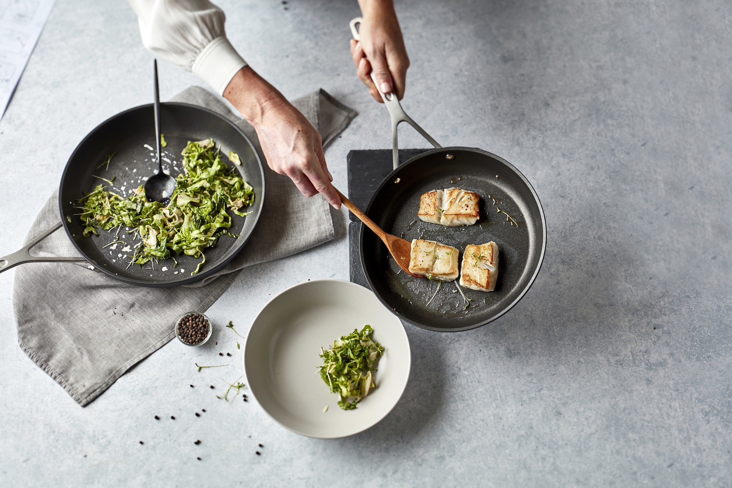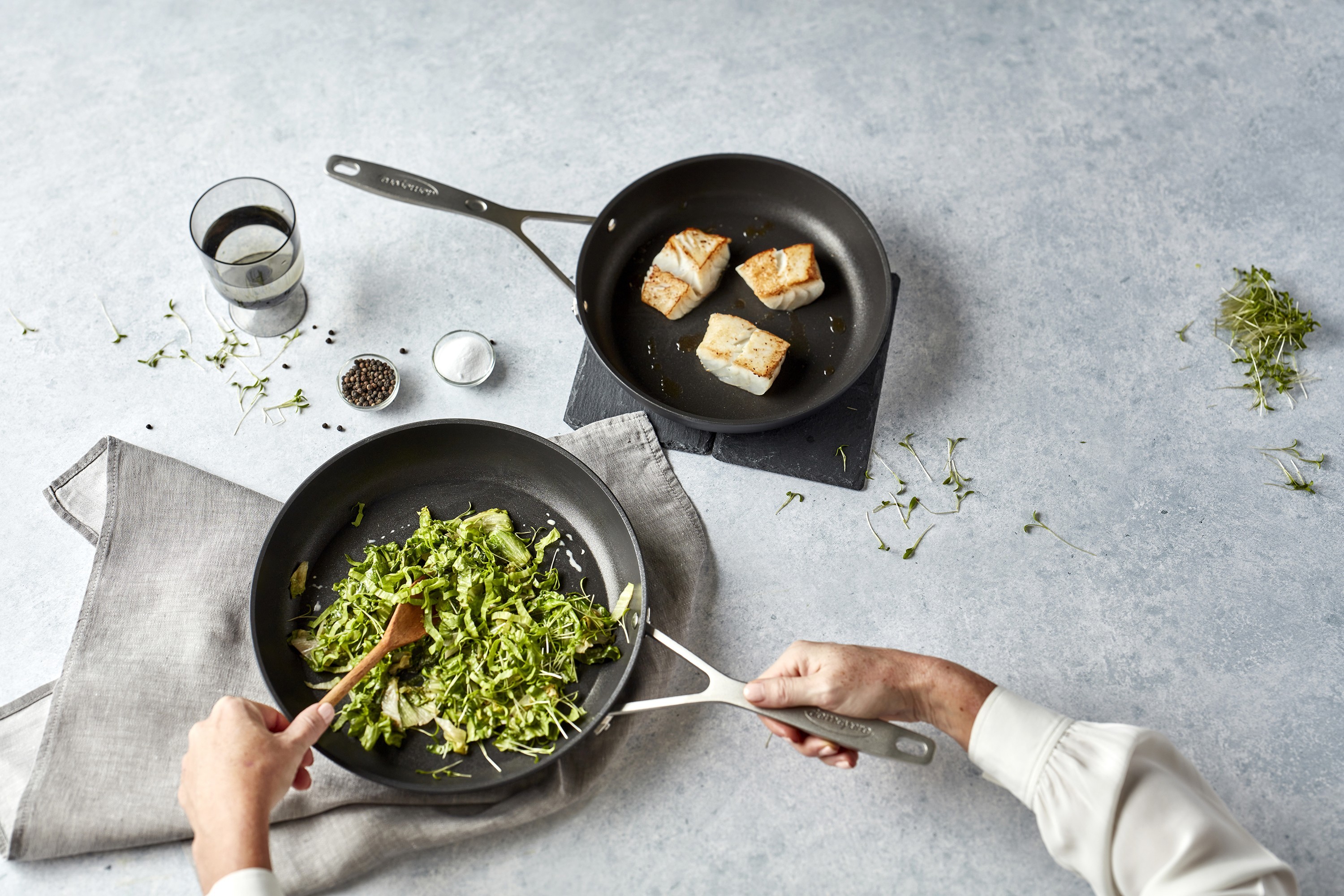Подходящ за всички котлони, включително индукционни, до 230°C. Не използвайте тигана на скара и не фламбирайте.