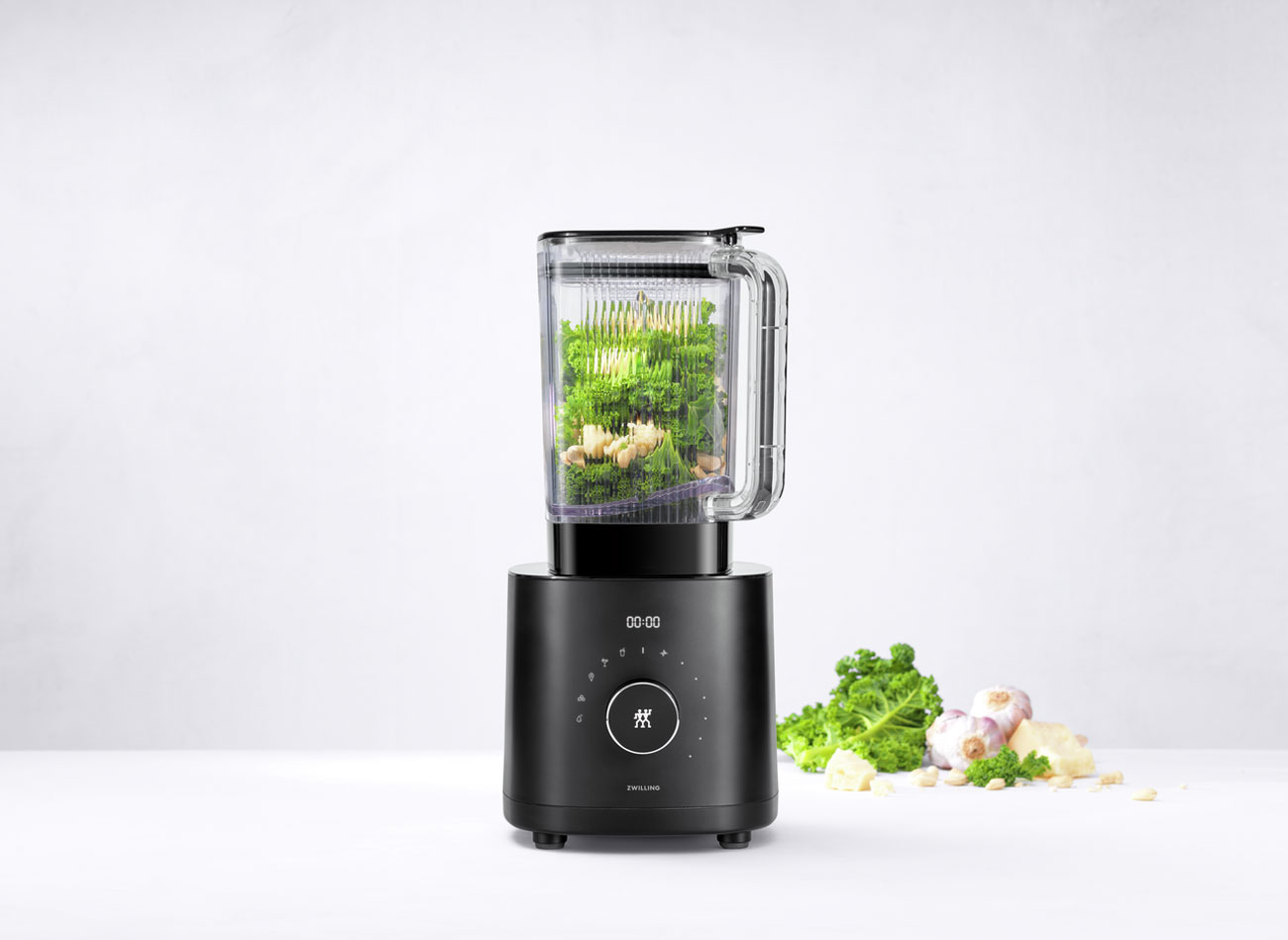 Блендерът за плот "Enfinigy", произведен от Zwilling , е високопроизводителен уред с вместимост 1,8 L, мощен 1600 W мотор и 6 предварително зададени програми.