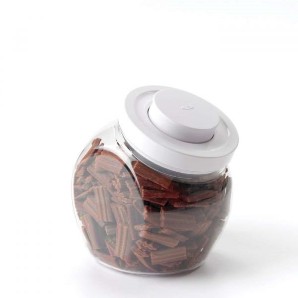 С практичен и модерен дизайн, бурканът за бисквитки Oxo е оборудван с уникален механизъм за затваряне, специфичен за гамата, а именно pop-up бутон и силиконово уплътнение. Механизмът затваря идеално буркана с едно натискане на бутона. Когато е повдигнат, бутонът служи и като дръжка, която позволява капакът да се сваля с една ръка.