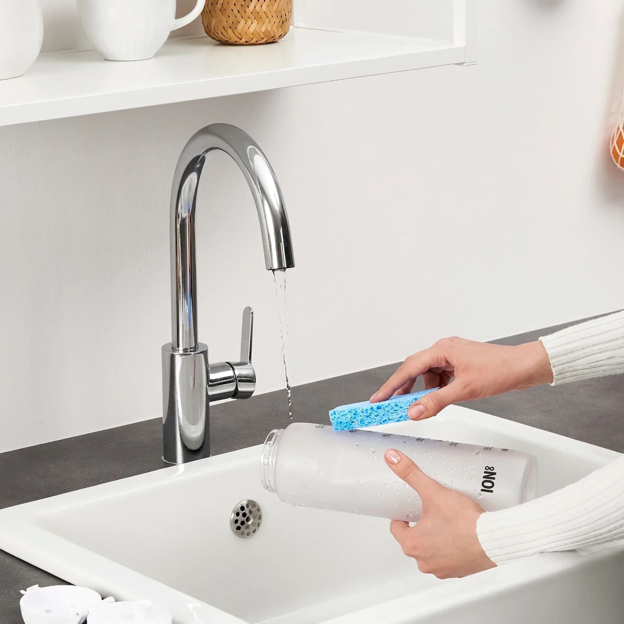 Изплакнете бутилката и капачката със студена вода преди употреба. След употреба изплакнете само с топла вода и препарат за съдове. Не търкайте с четки или абразивни материали. Изсушете добре на въздух преди съхранение със затворена капачка. Измийте ръчно или използвайте съдомиялна машина при цикъл на студено измиване.