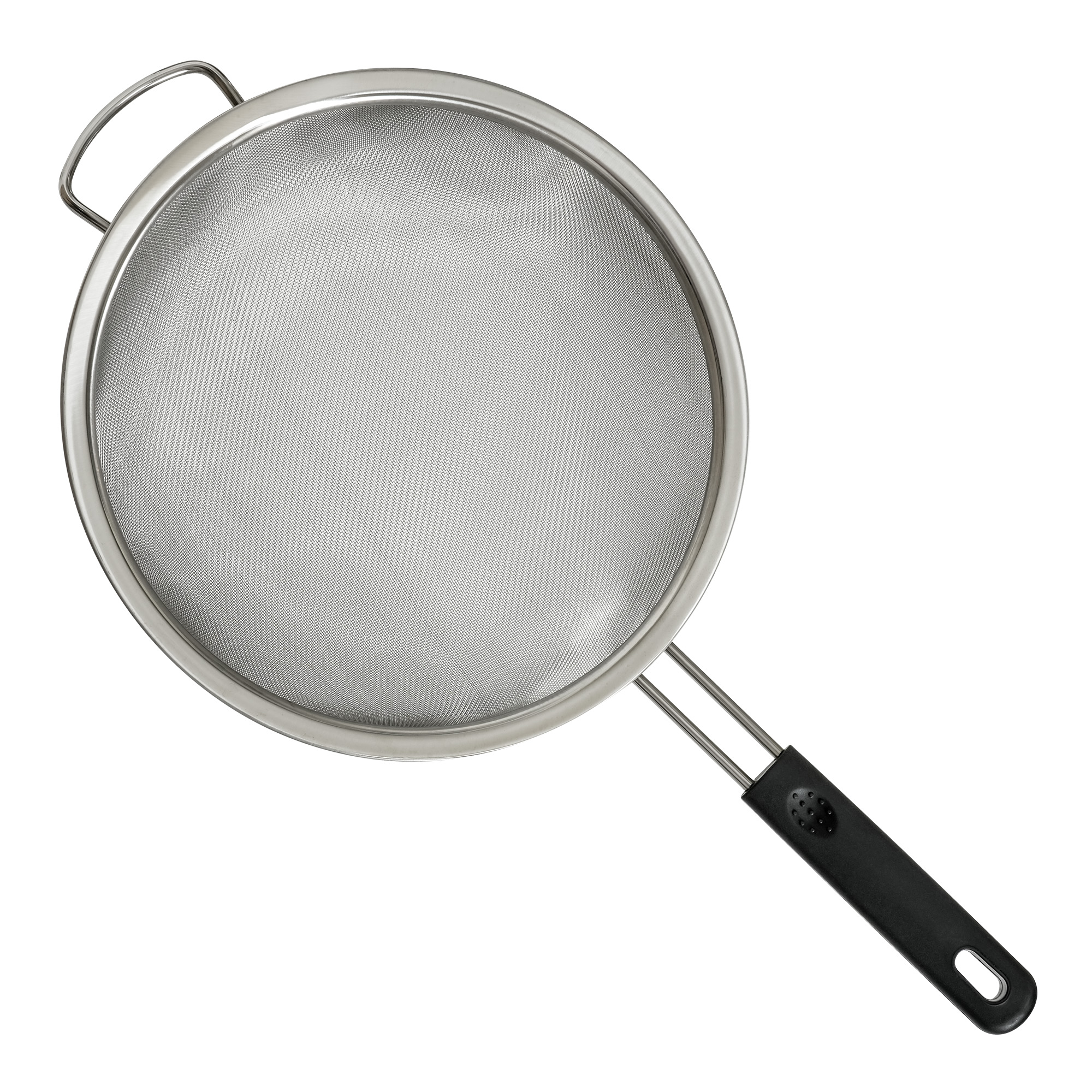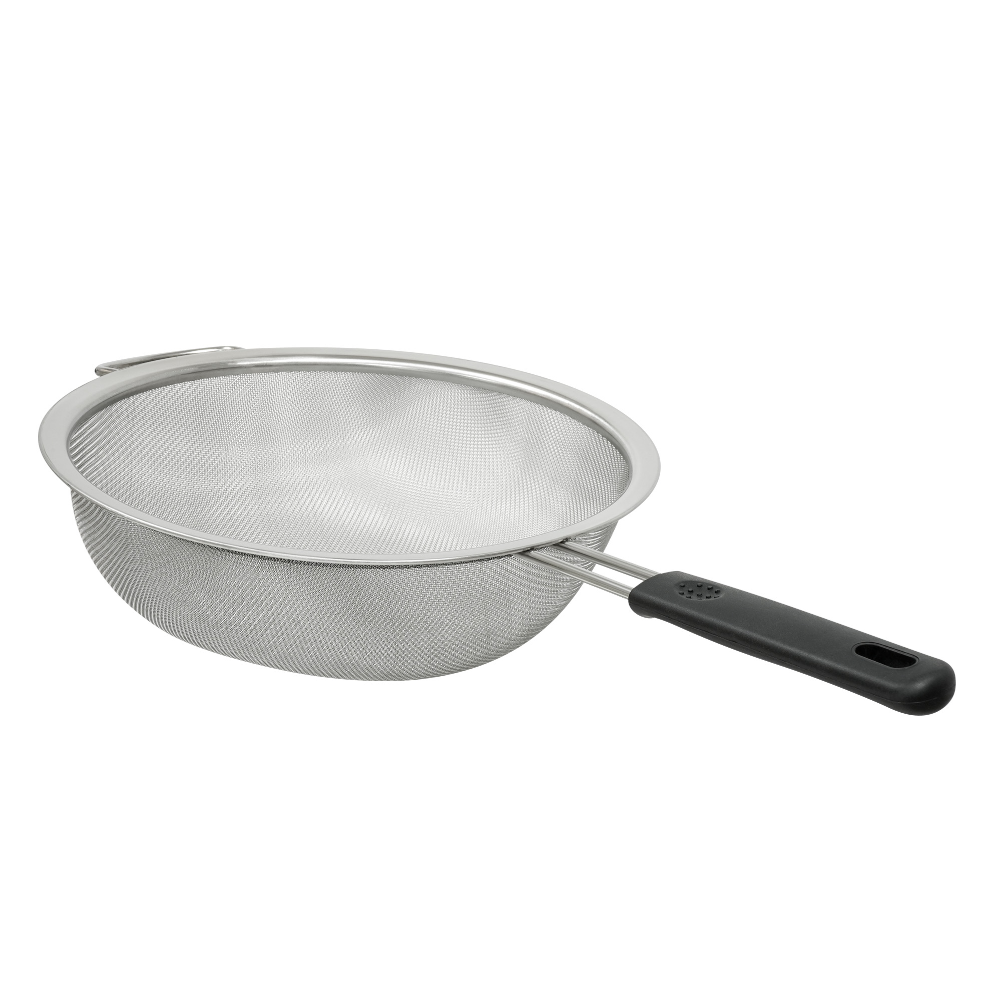 Цедка от неръждаема стомана, произведена от Zokura, диаметър 25,6 см, с пластмасова дръжка и филтър от фина мрежа.