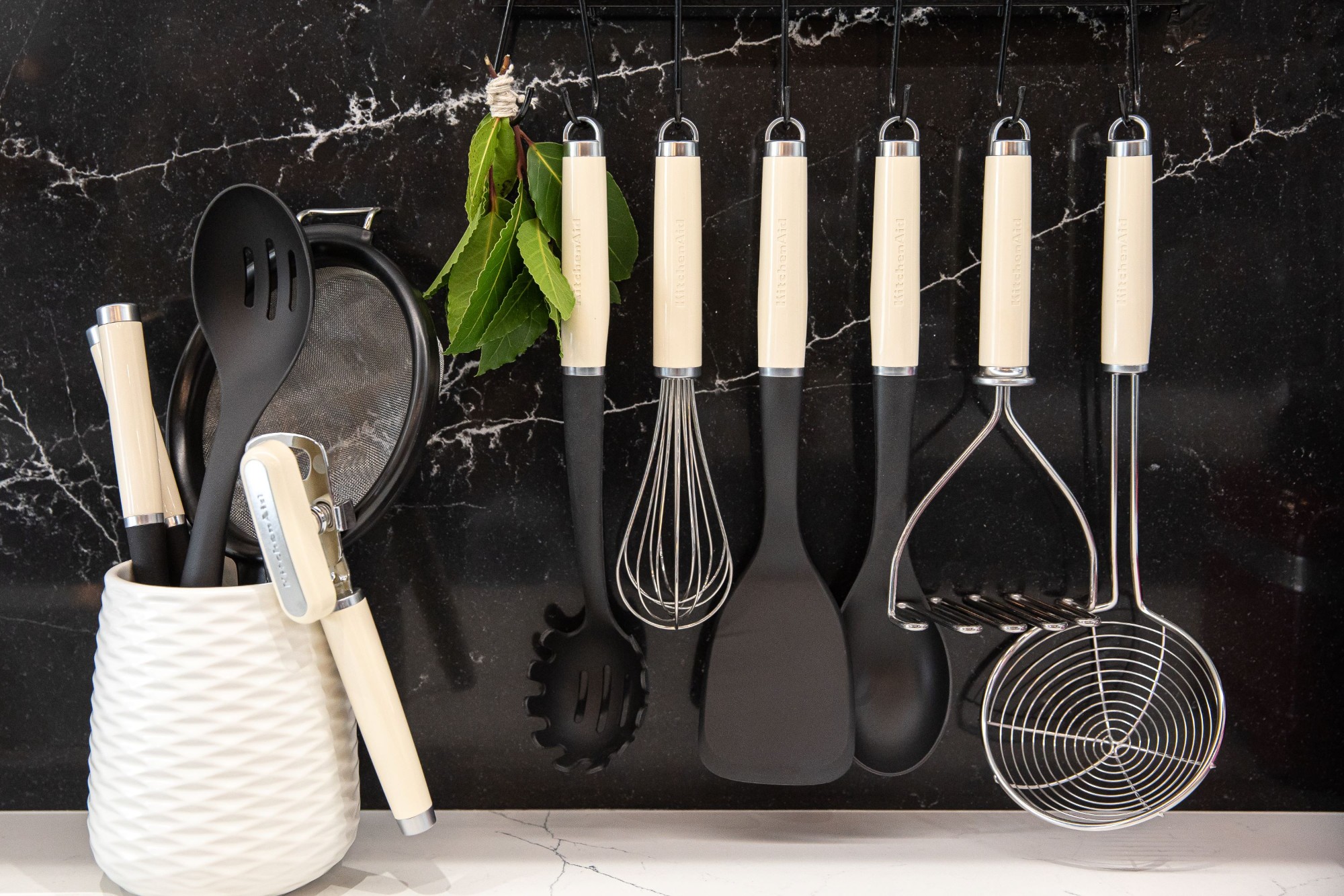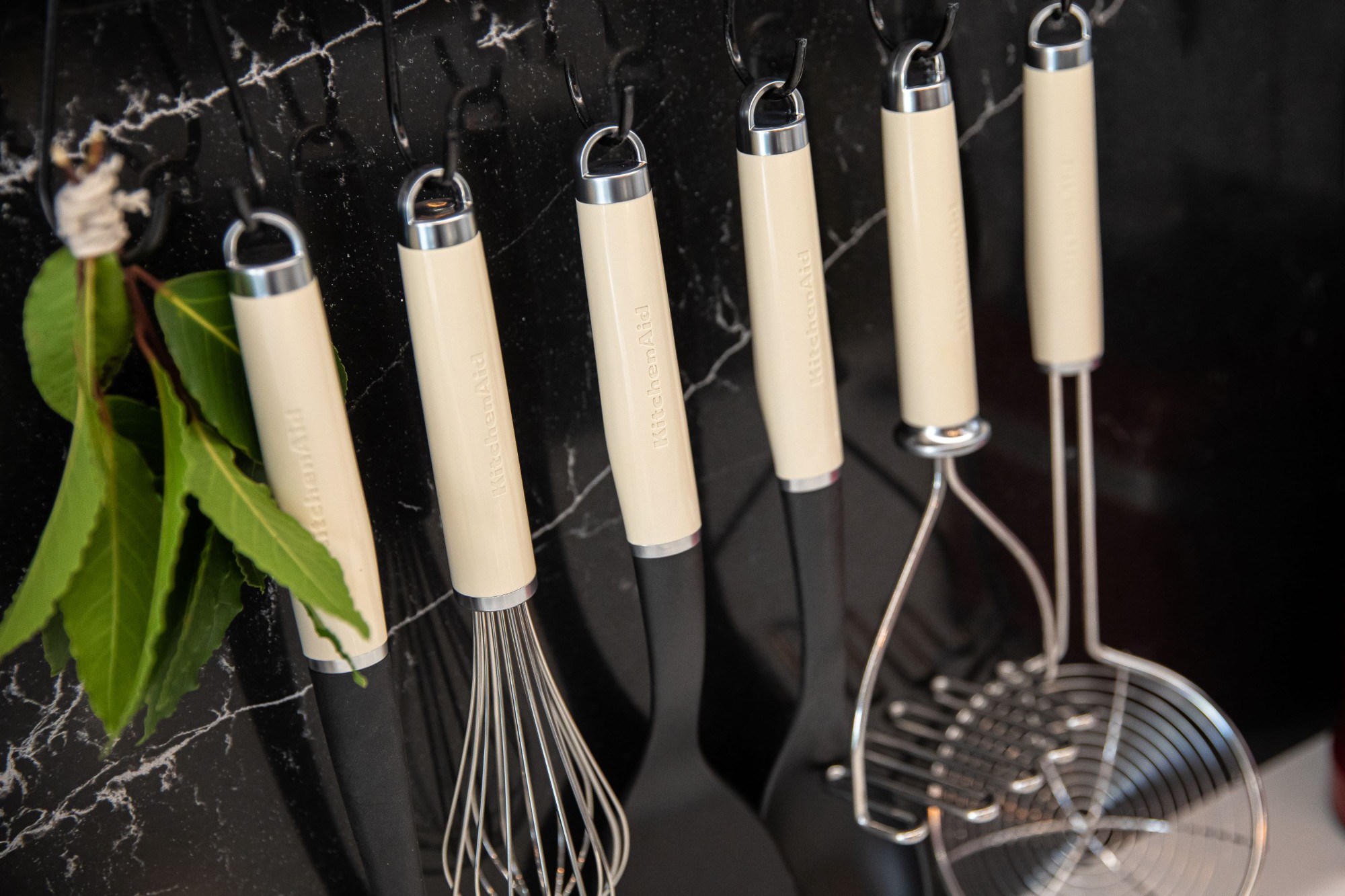 Тази цедка KitchenAid с нишки във формата на паяжина лесно отстранява кнедли с грис, китайски кнедли или пържени храни от съдове за готвене.
