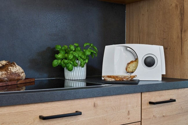 Сгъваемият му дизайн позволява удобно съхранение. В сгънато състояние слайсерът е широк само 10,5 см, което го прави идеален избор за компактни кухни.