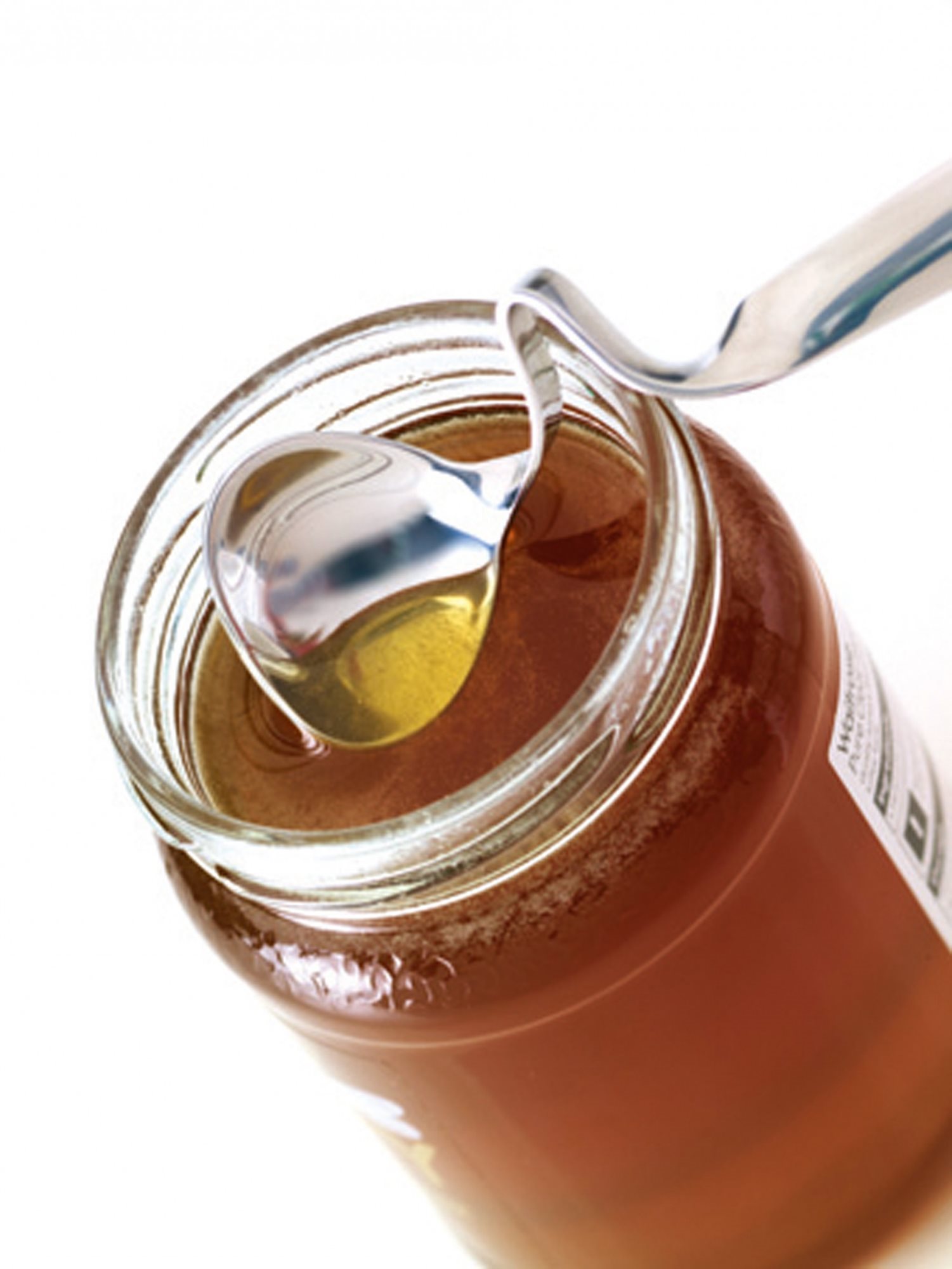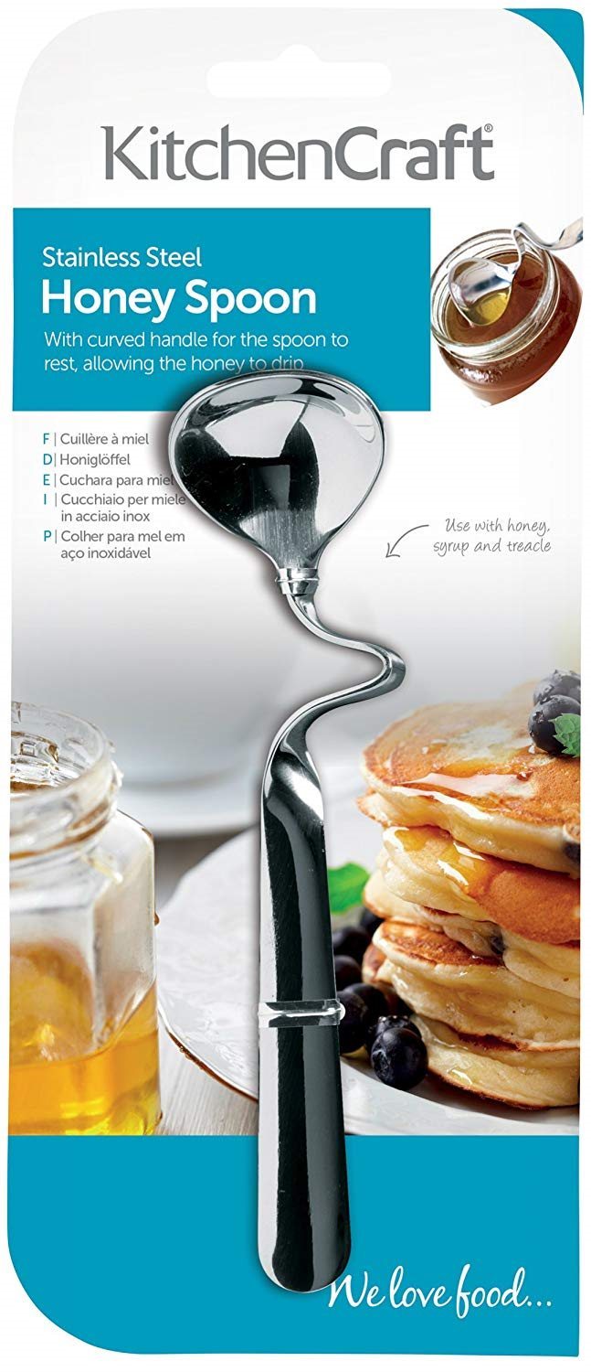 Мед лъжица, марка Kitchen Craft, изработена от неръждаема стомана, със специално извита дръжка, за да позволи лъжицата да бъде поставена на ръба на контейнера за мед.