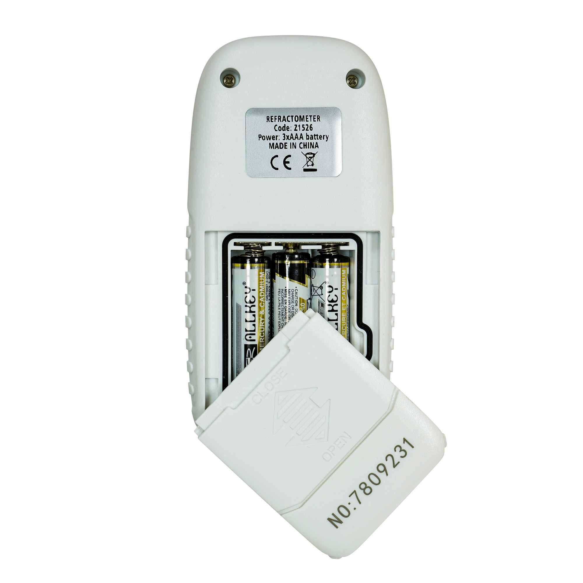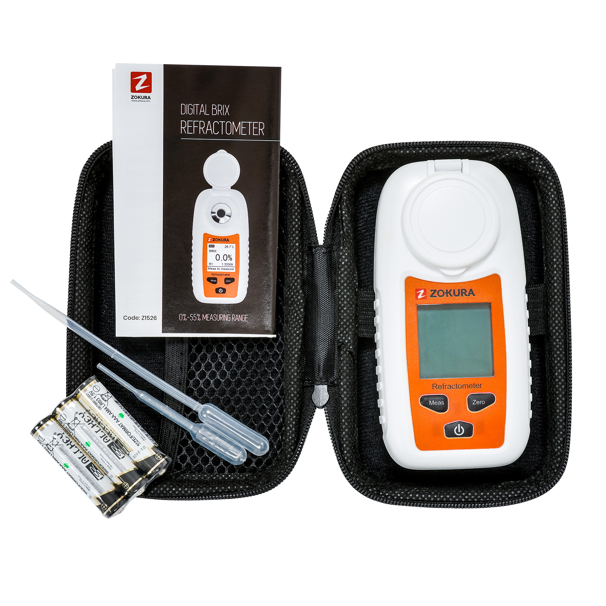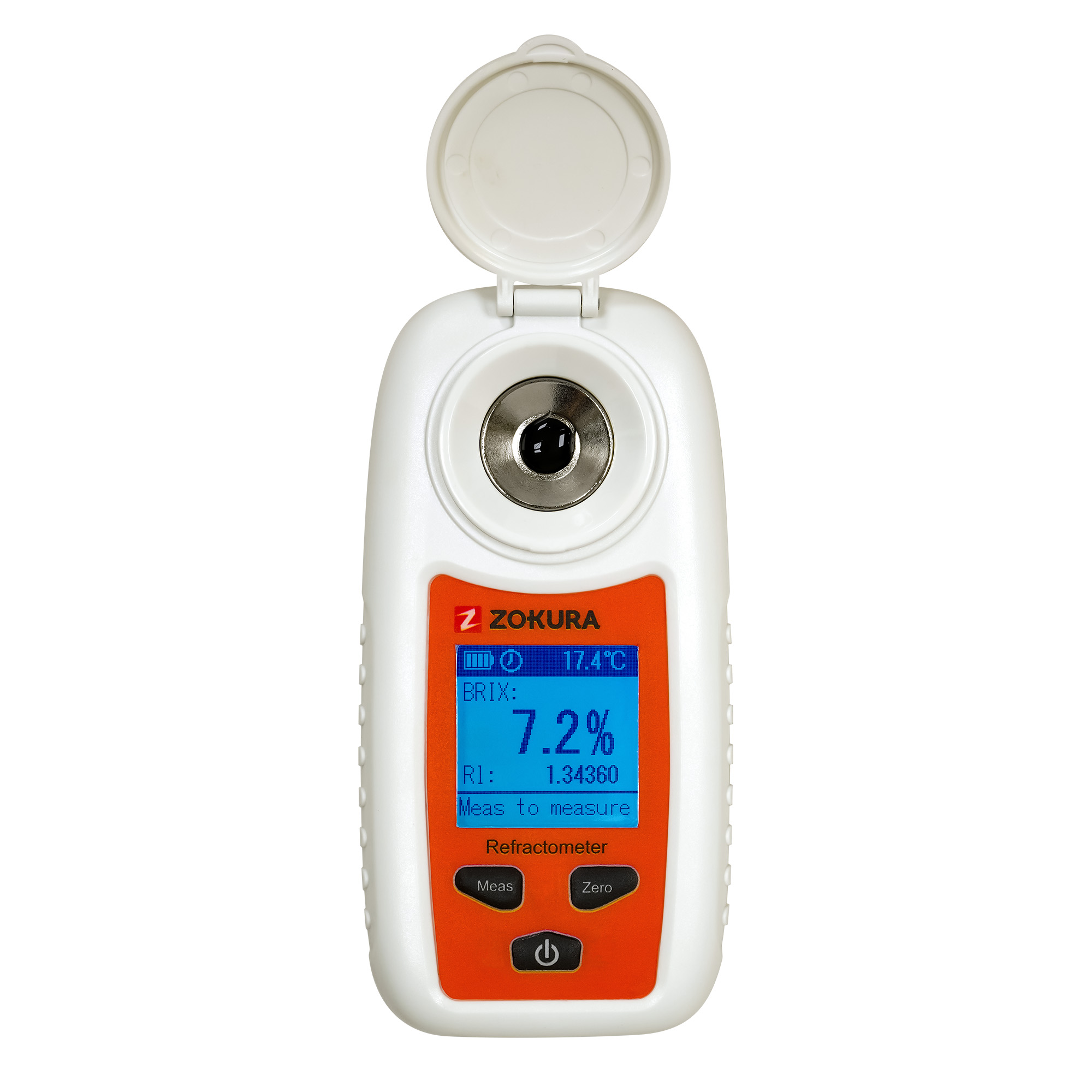 ATC рефрактометър (Автоматично компенсиране на температурата), лек и преносим, за измерване на съдържанието на захар в разтвори като захарен сироп, плодови сокове, безалкохолни напитки, алкохолни напитки и др.