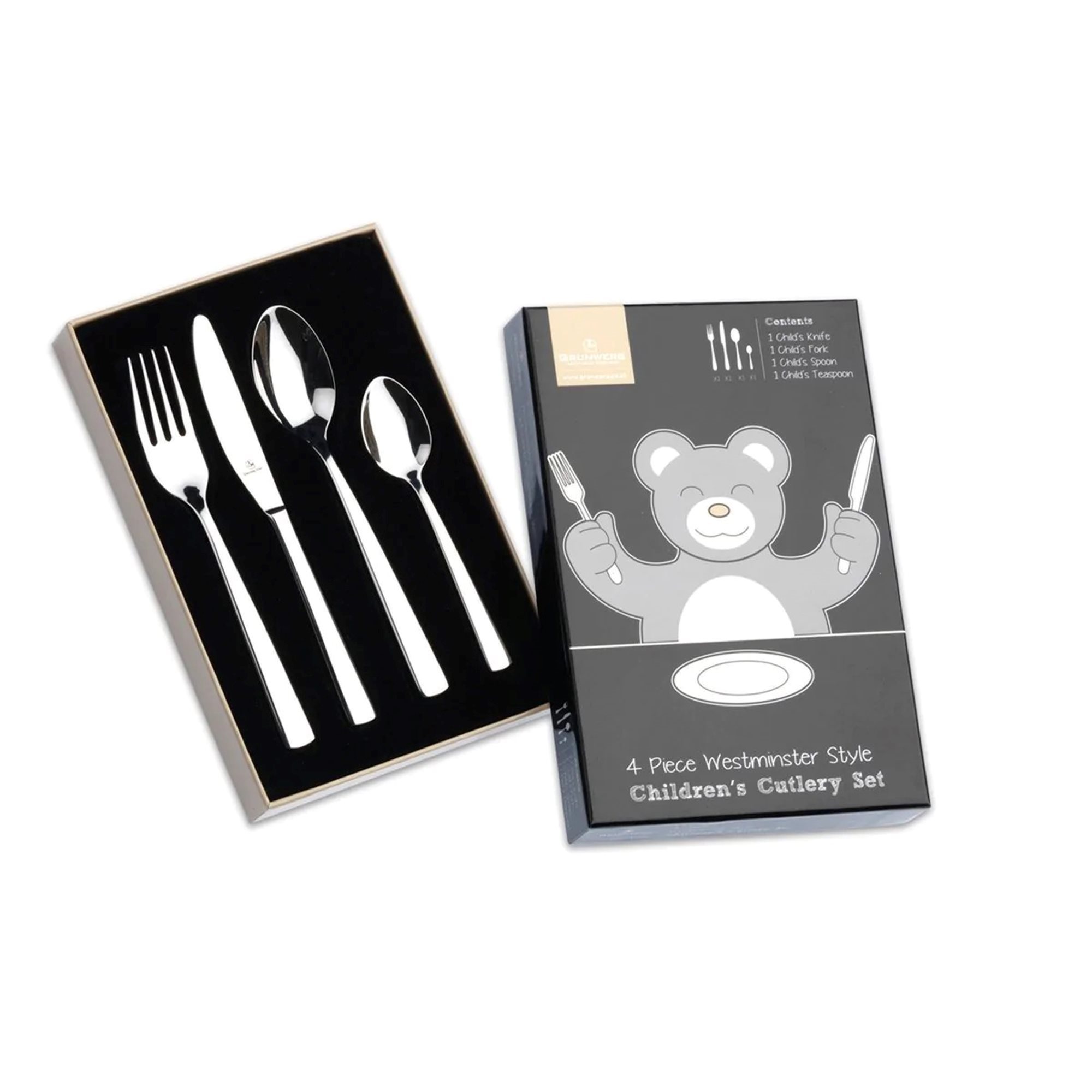 Детски комплект прибори за хранене Grunwerg, изработен от първокласна неръждаема стомана 18/10, състоящ се от:
