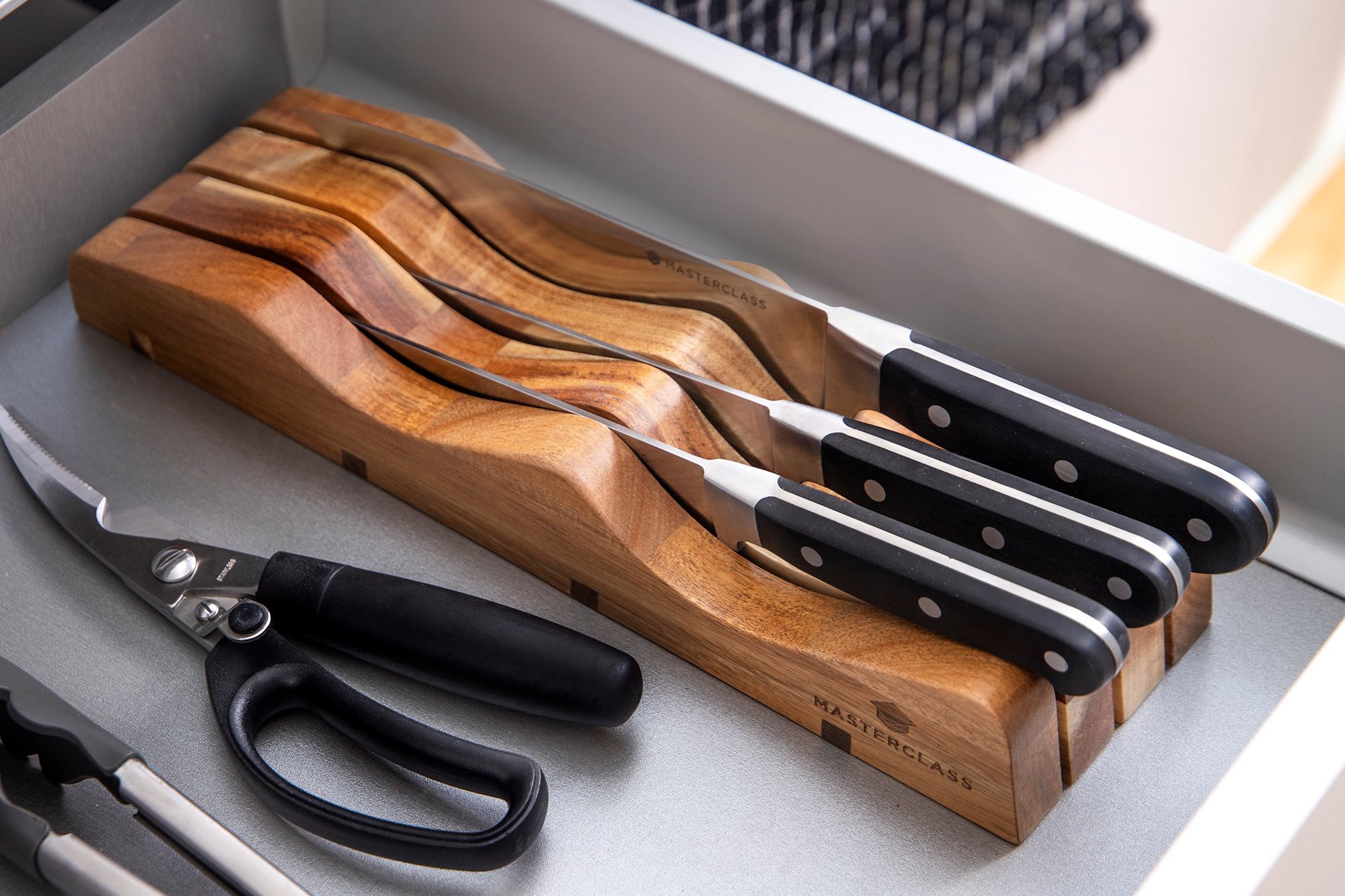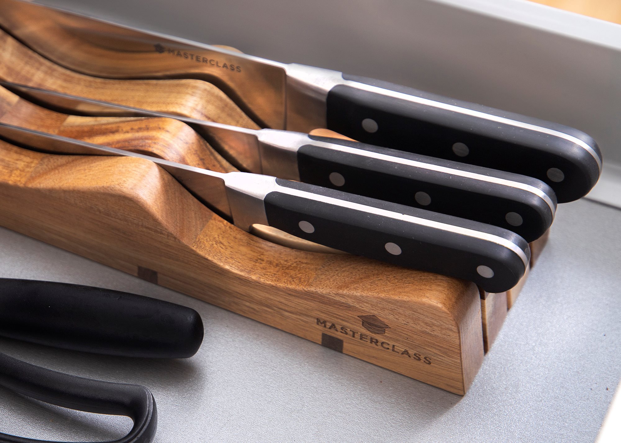 Спестете място и дръжте кухненските ножове безопасно прибрани в чекмеджета с помощта на държача от MasterClass.