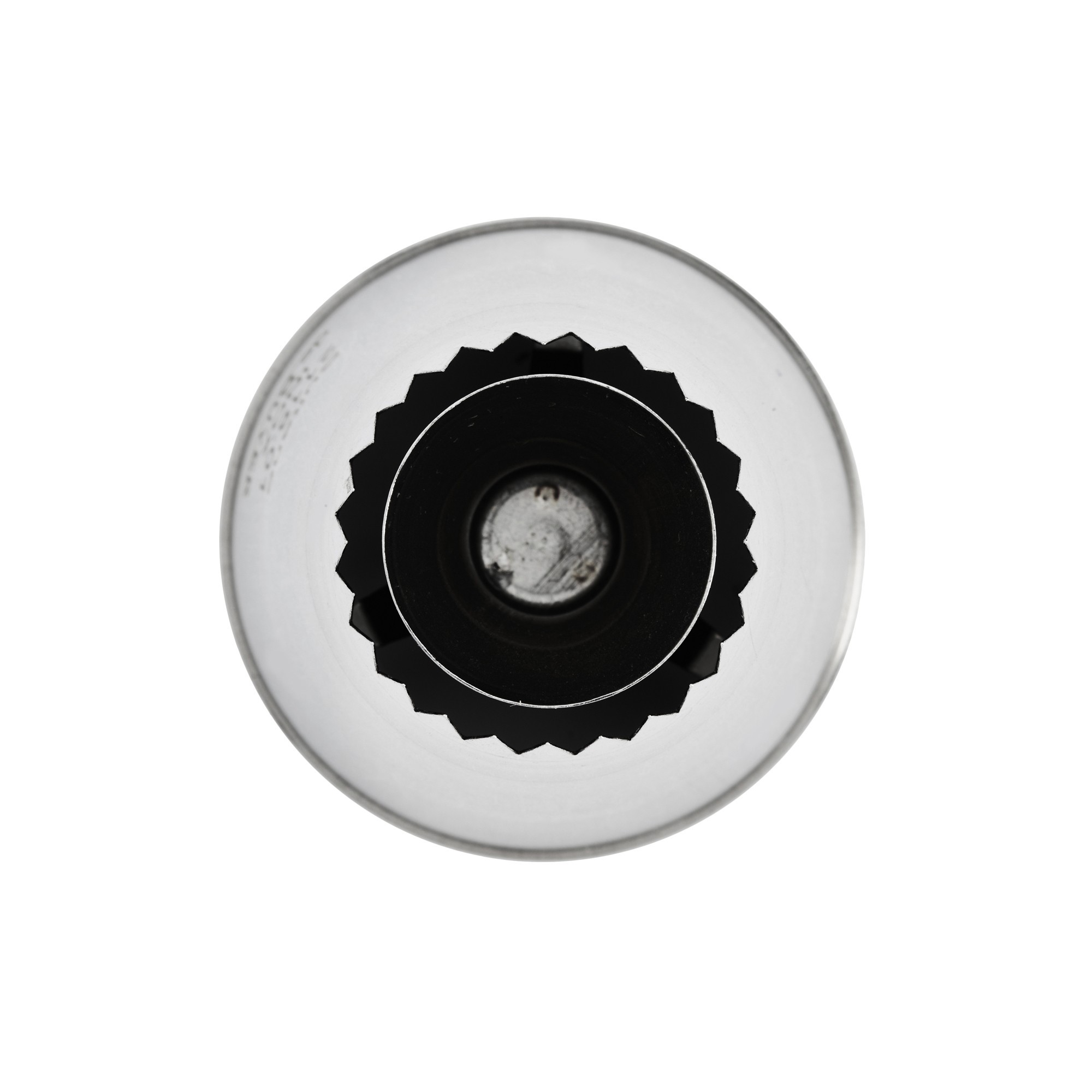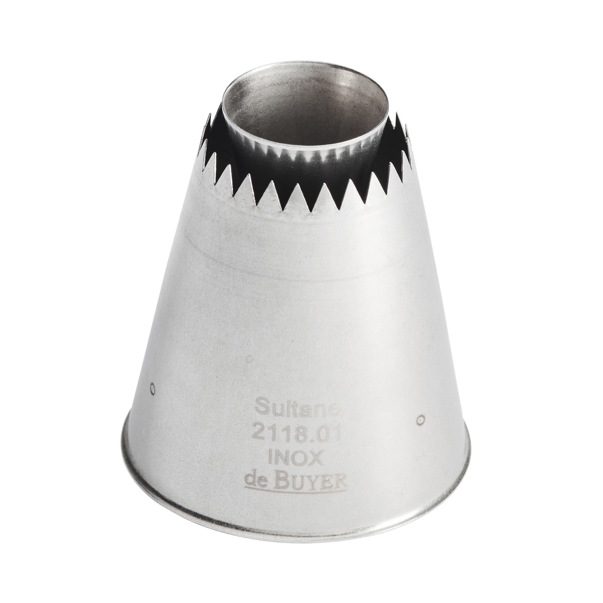 Накрайник с двоен накрайник от неръждаема стомана, марка de Buyer, за украса на торти. Вътрешният ръб е коничен, а външният - назъбен.