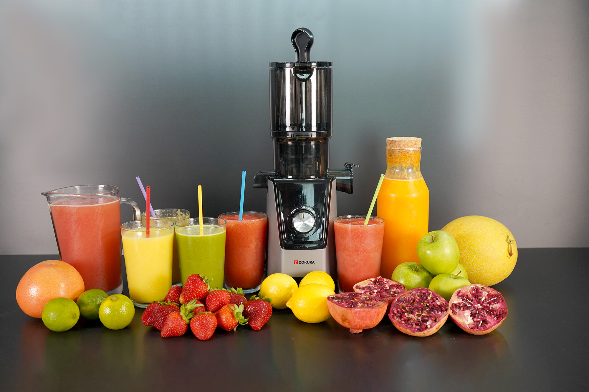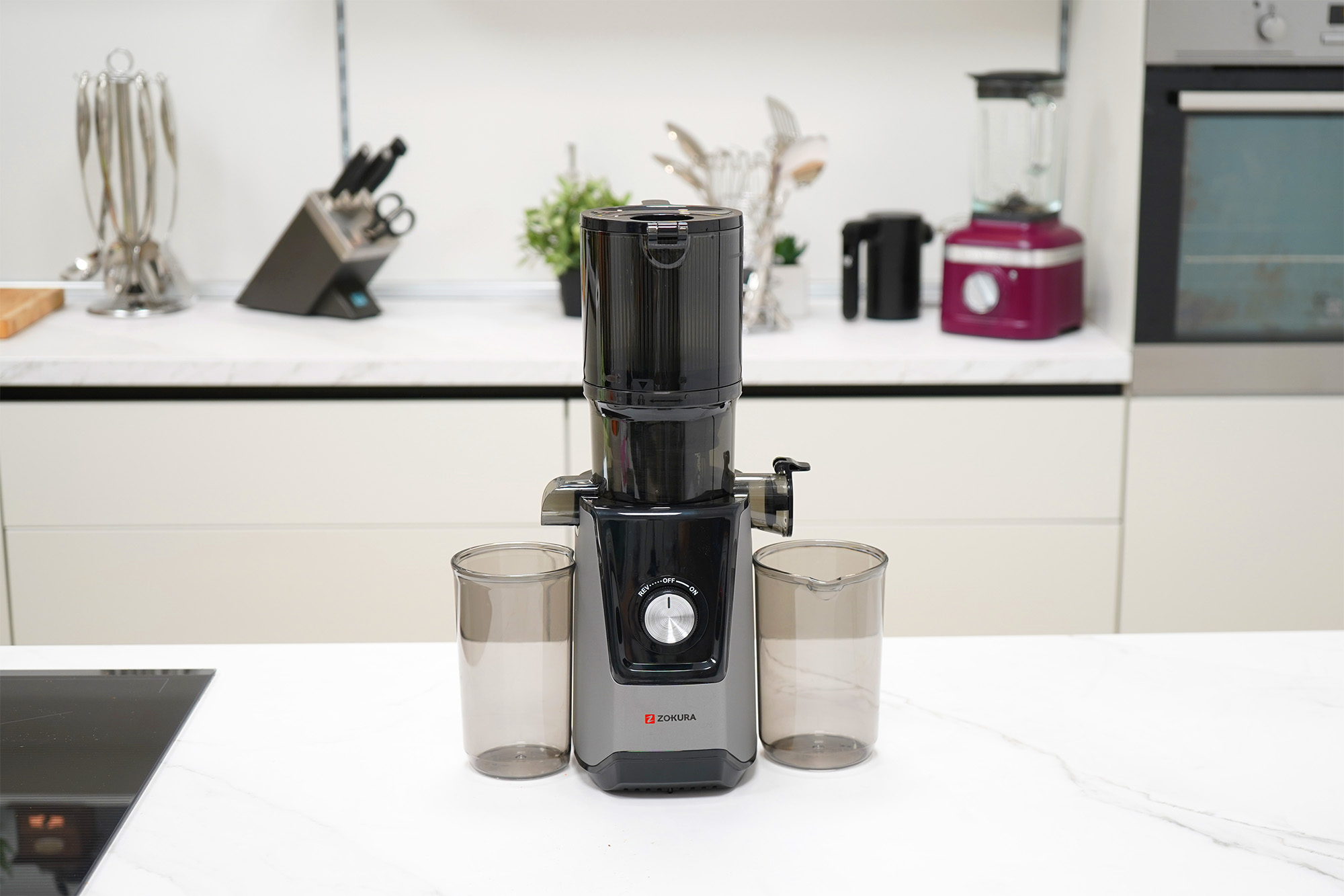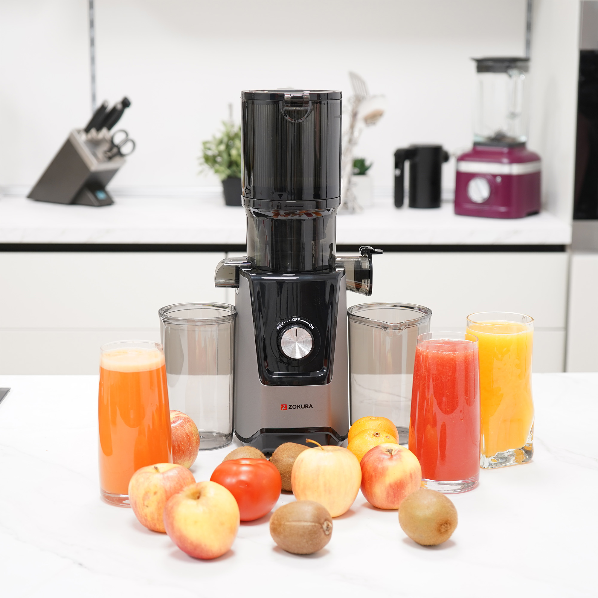 Бавна студено пресована електрическа сокоизстисквачка за плодове и зеленчуци, с широк улей за хранене, произведена от Zokura.