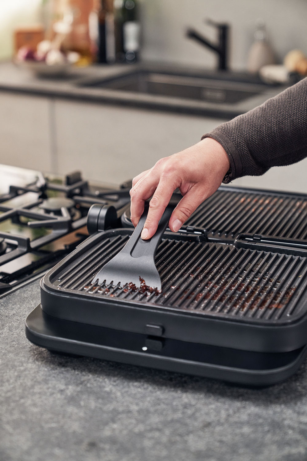 Функцията 2 в 1 позволява да се използва затворен (контактна решетка) или отворен под ъгъл от 180° в режим на изключително голямо барбекю.