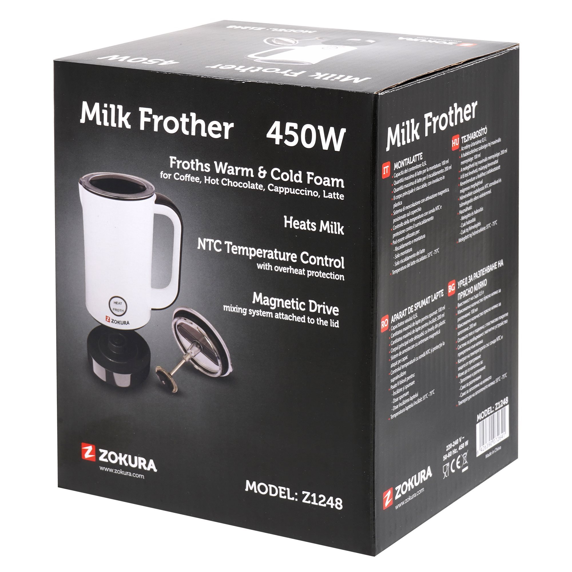 С този електрически уред за разпенване на мляко, произведен от Zokura, можете да приготвите за нула време капучино, макиато, cafe au lait или flat white. Това е електрически уред за разпенване с мощност 450 W и капацитет за разпенване 100 ml.