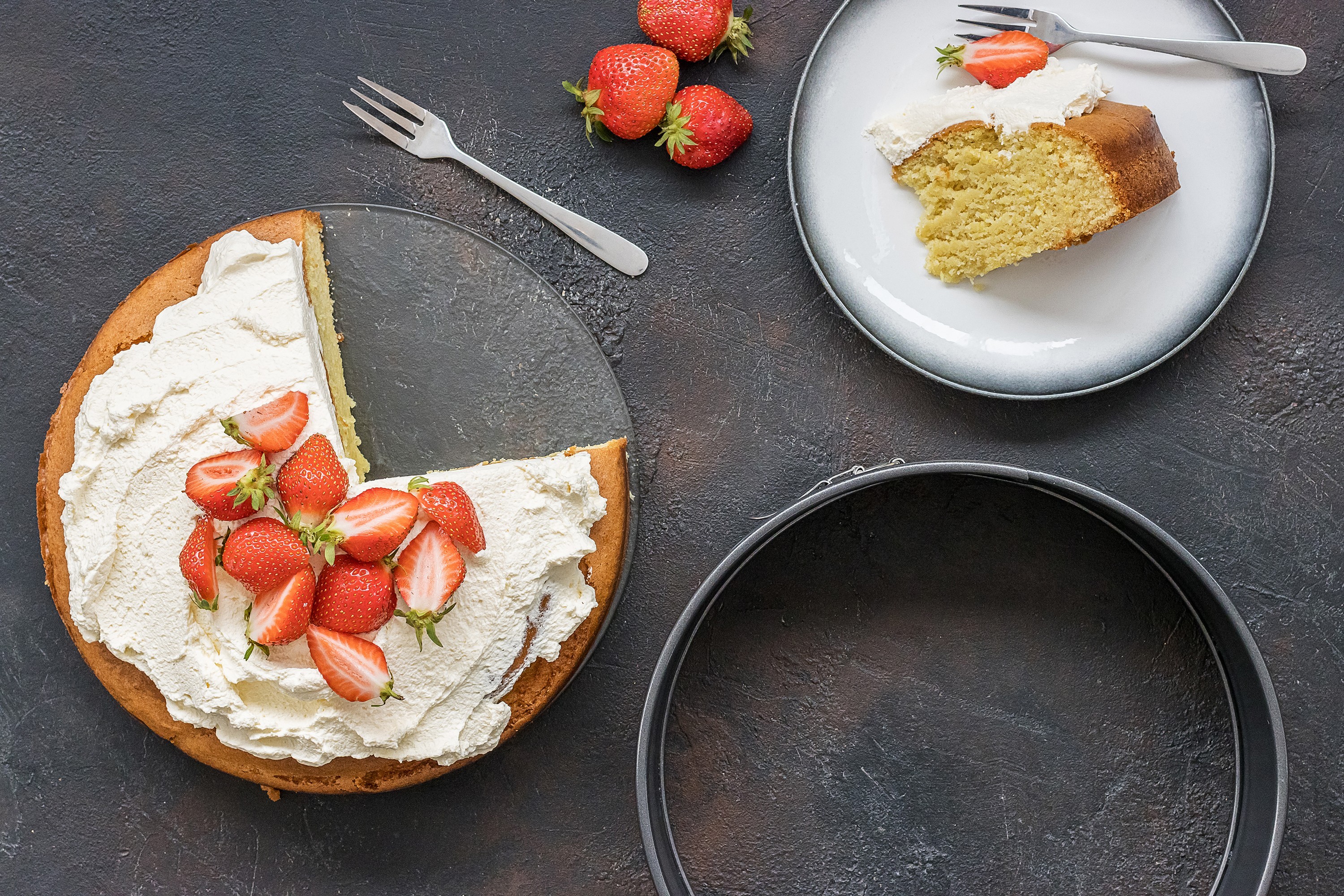 С тази тава най-накрая можете да изберете, защото можете да украсите тортата, като я оставите в тавата и едва след това да я „пуснете“ за сервиране върху стъклената основа, която се превръща в семпла и дискретна чиния.