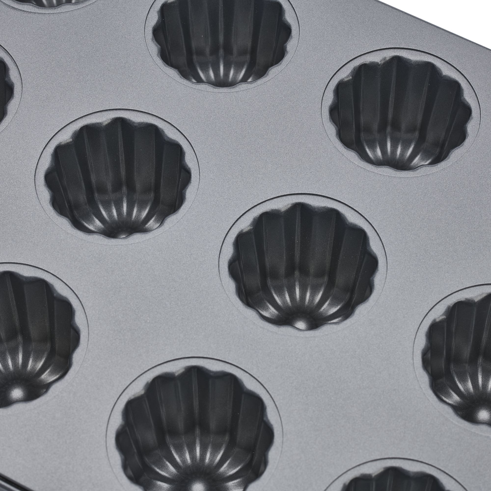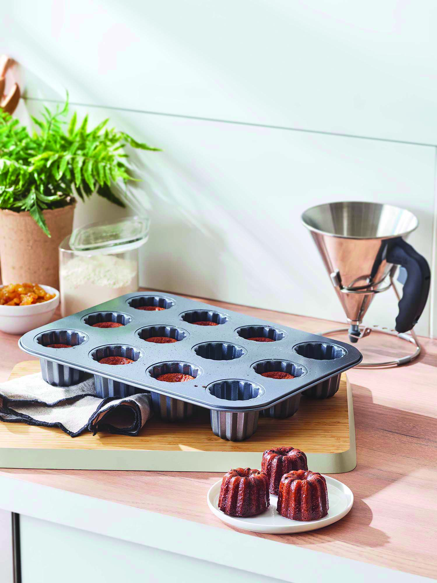 Тава за печене Canneles, с 12 отделения, изработена от стомана, с незалепващо покритие, марка de Buyer.