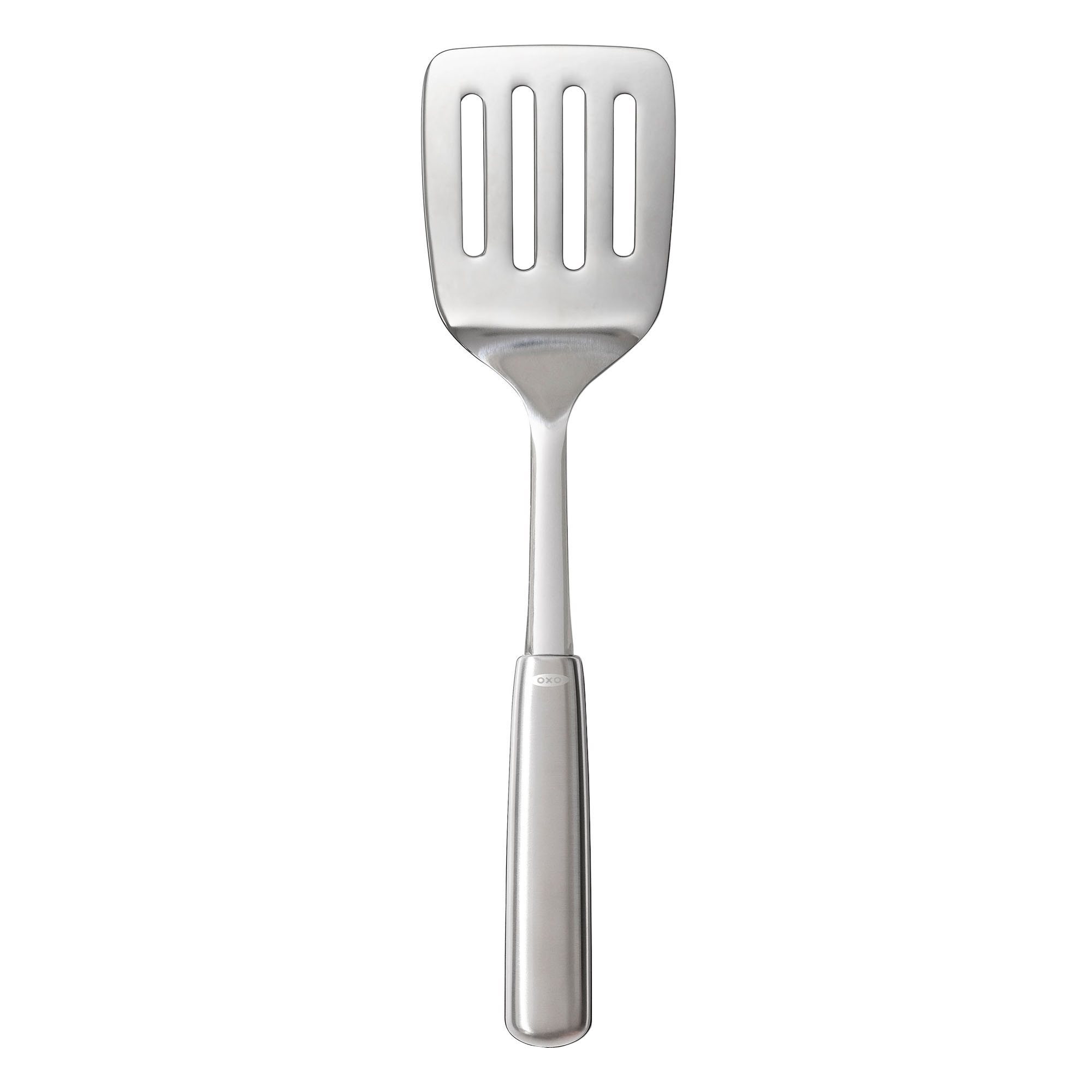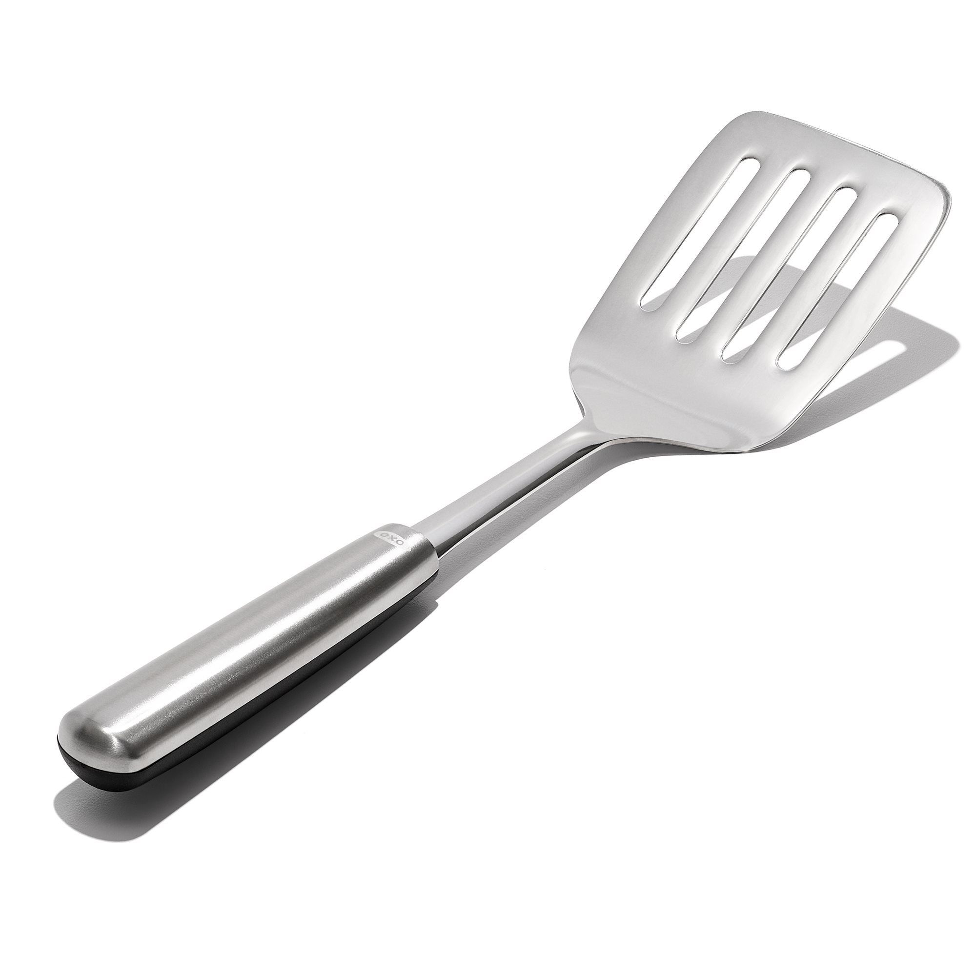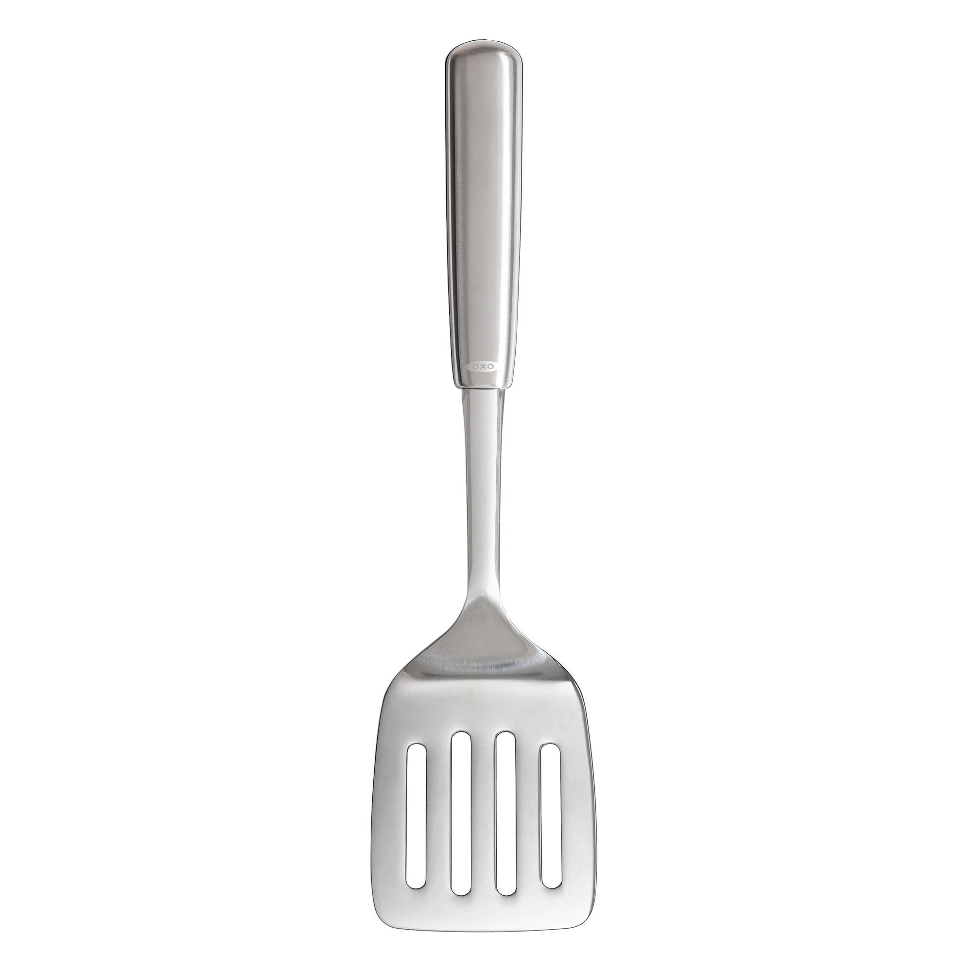 Готварска шпатула, изработена от неръждаема стомана, подходяща за обръщане на бургери, яйца или палачинки, марка OXO Steel.