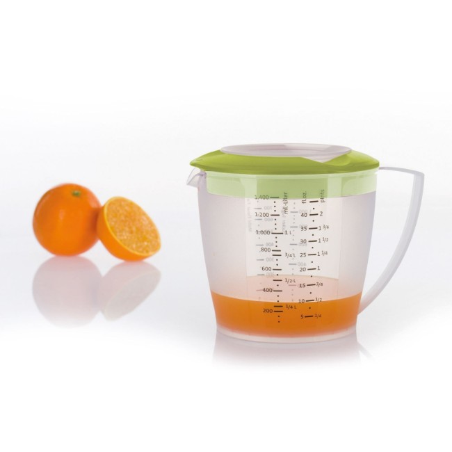 Мерителната кана има изписани мерителни единици в: мл, литри, pint за течности и грамове.