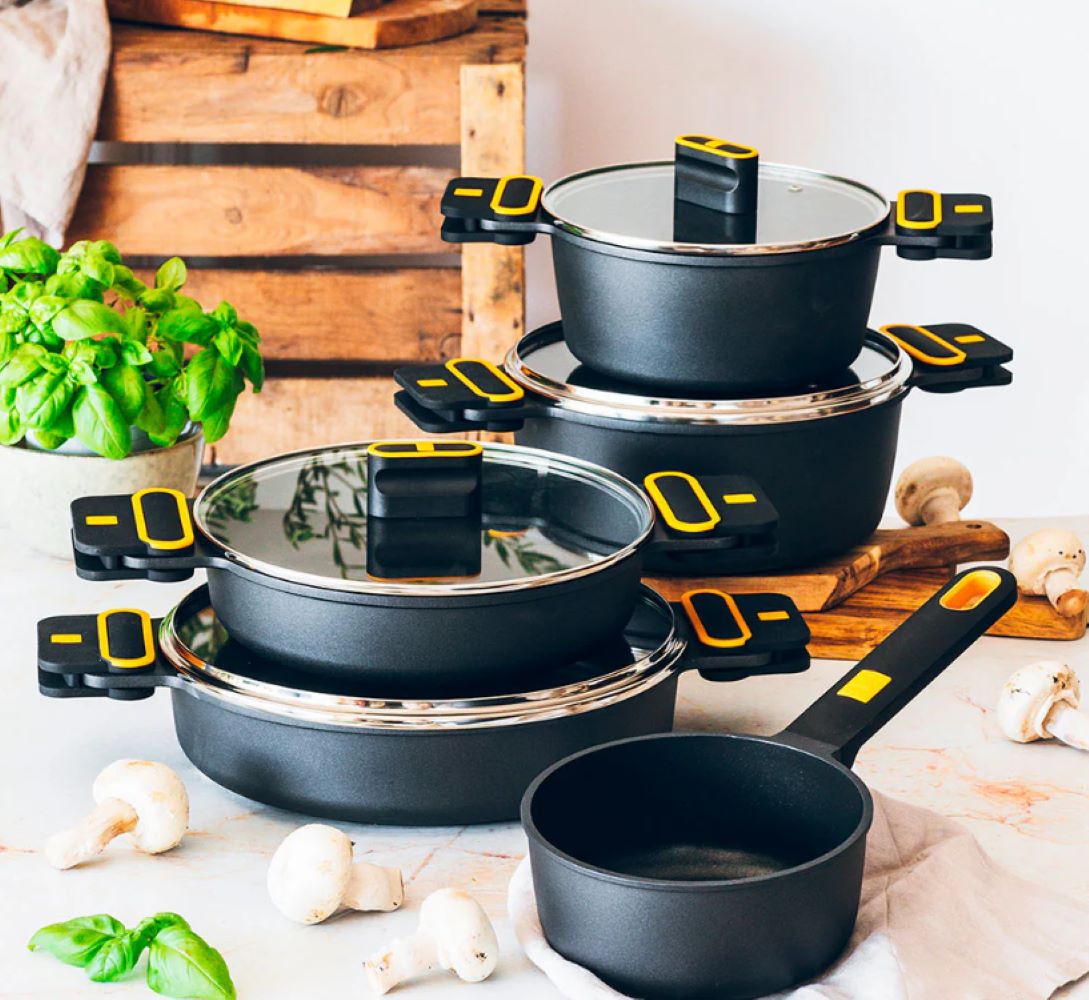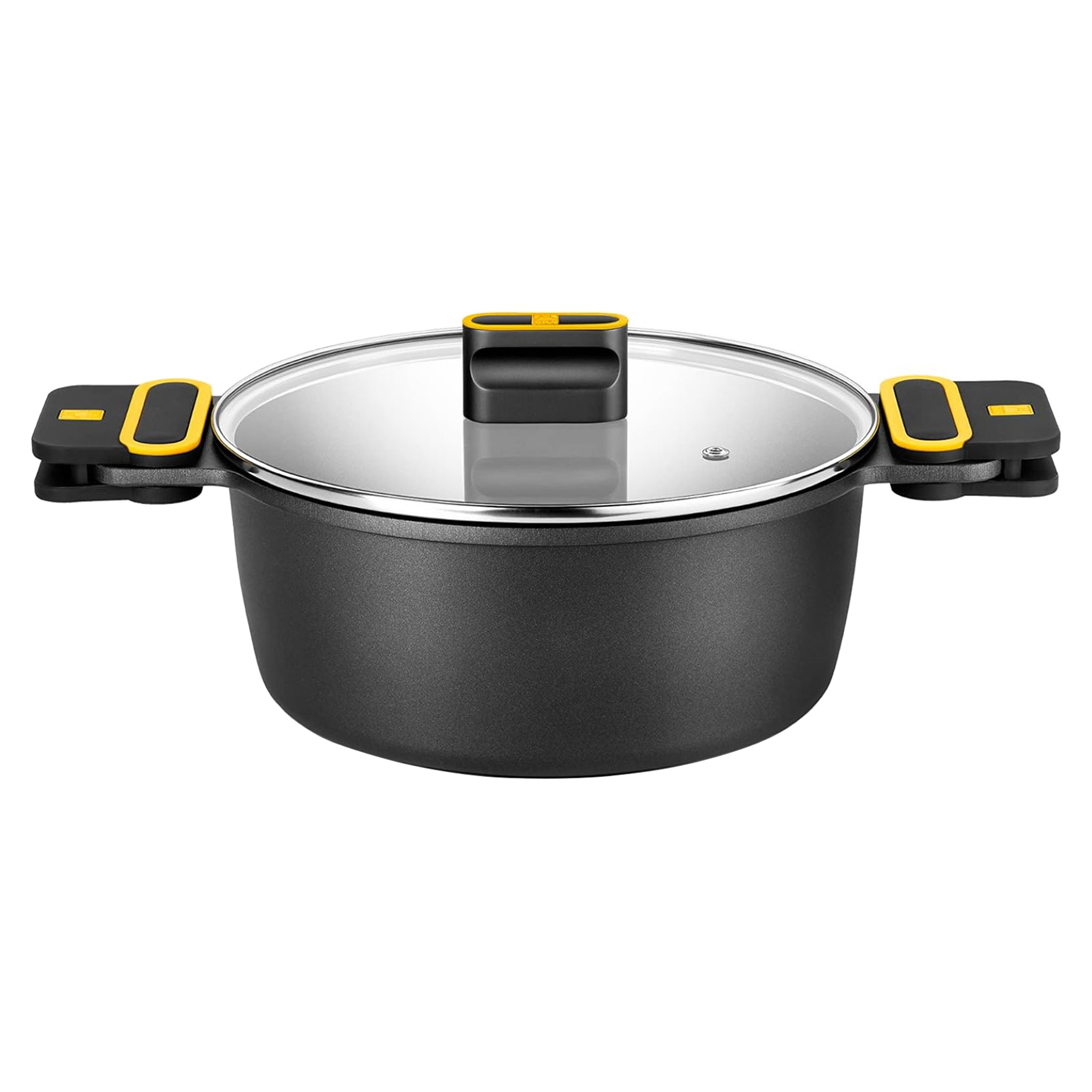 Има ултраустойчива повърхност, а дръжките позволяват сигурен и удобен захват. Както силиконовите дръжки, така и бакелитовото копче на стъкления капак са черни с жълти детайли, елементи, специфични за колекцията Daily Pro .
