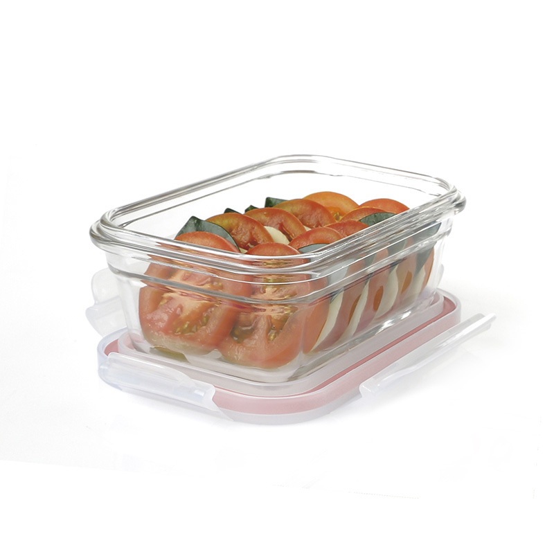 Правоъгълен съд за съхранение на храни, с капак, произведен от Glasslock, вместимост 485 ml, размер 14,8 x 10 x 5,7 cm, изработен от специално стъкло, което е устойчиво на температури между -20 и +230°C.