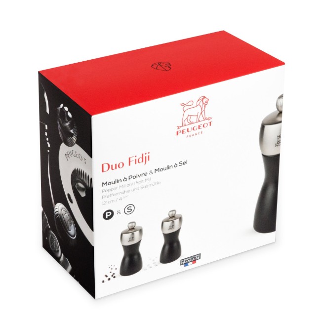 Мелничките за сол и черен пипер Peugeot от колекцията Fidji внасят специална елегантност на масата благодарение на дизайна си във формата на пясъчен часовник и на използваните материали.