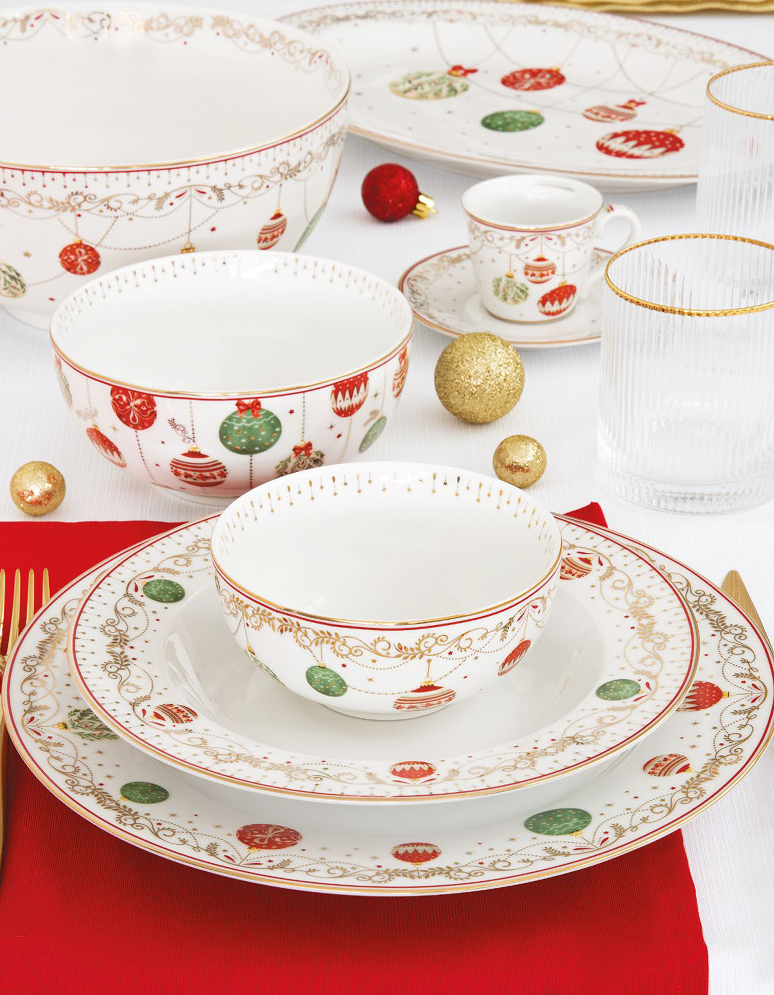 Колекцията Christmas Eve с цветен дизайн, включваща привлекателните коледни топчета, с които всяка година се украсява коледната елха, ще освежи вашата празнична трапеза.