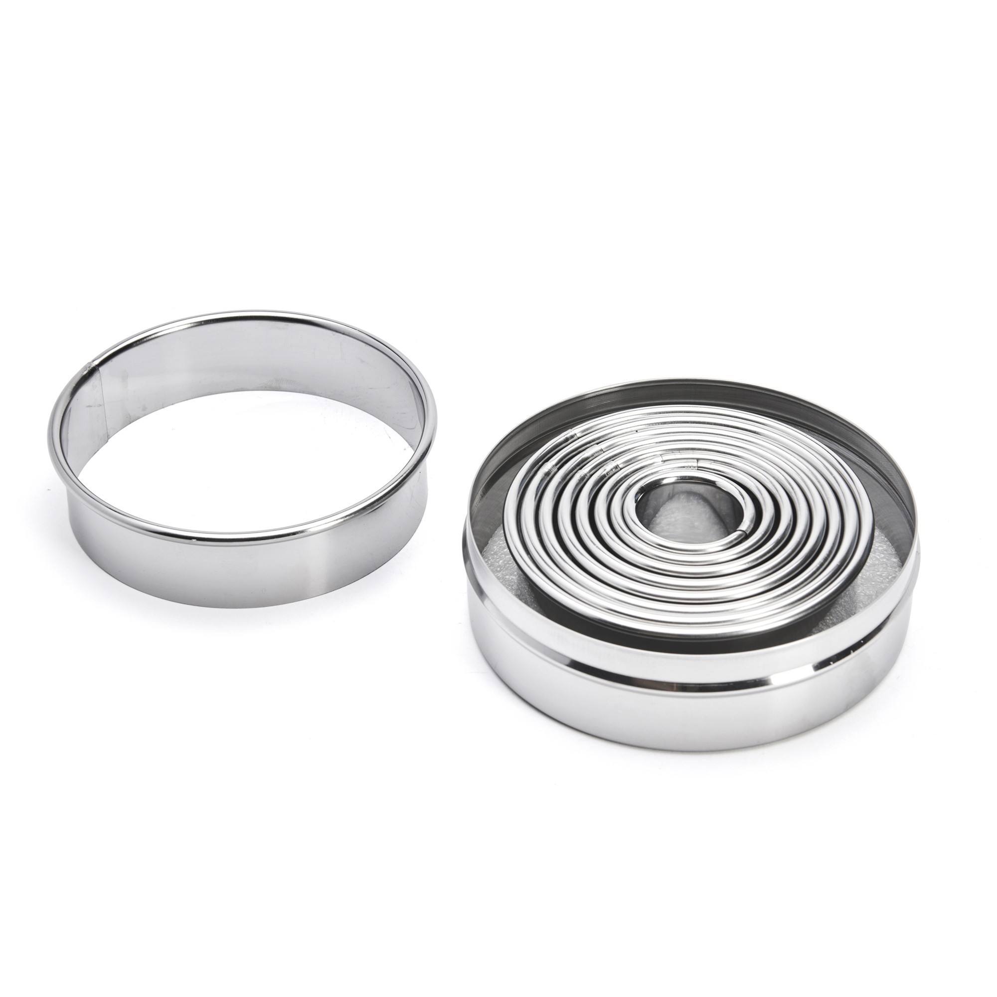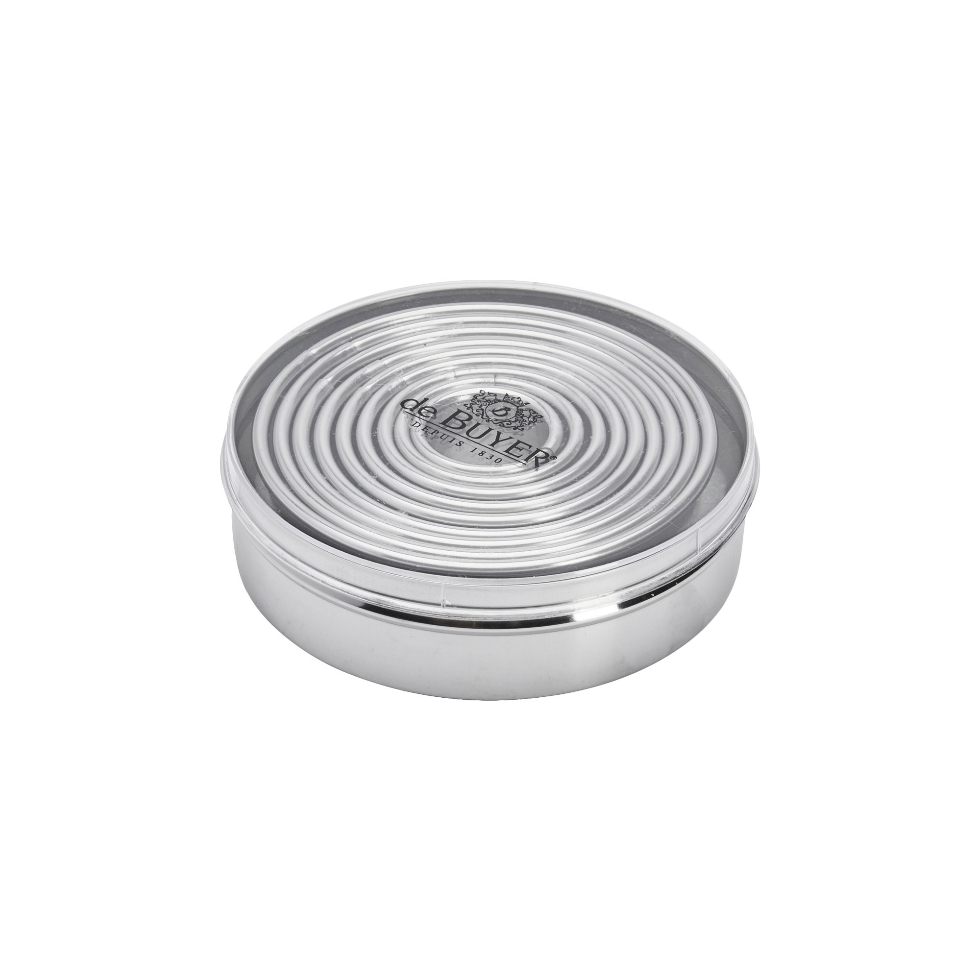 Комплект от 9 режещи устройства, марка de Buyer, направена от неръждаема стомана е много здрава и запази формата си поради материала, от който са изработени, имащи променливи диаметри: от 3 см до 11 см, височина 3,5 см, като всички те са идеални за създаване на основата на тартове или други торти.