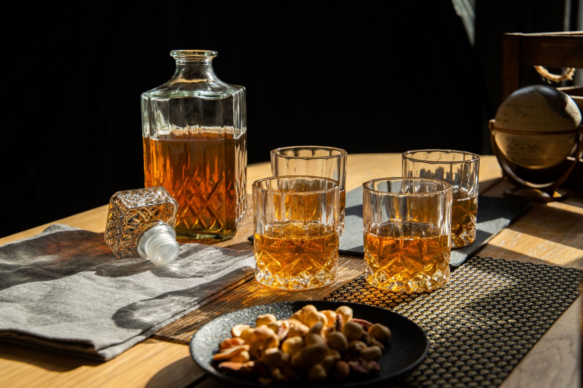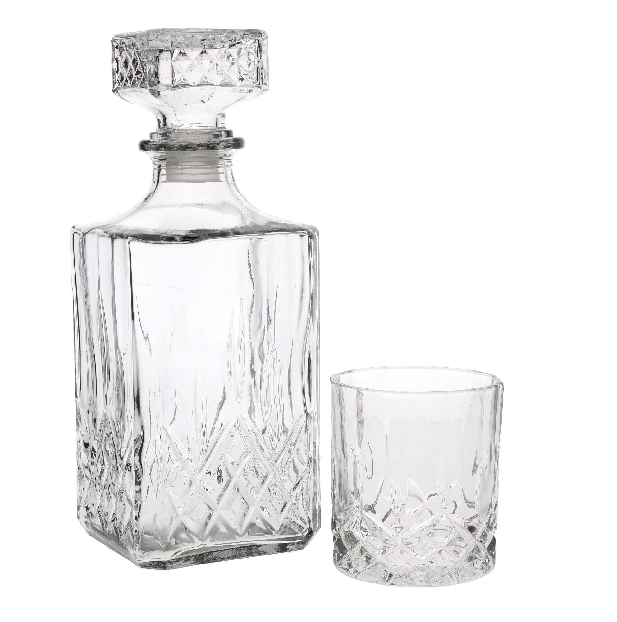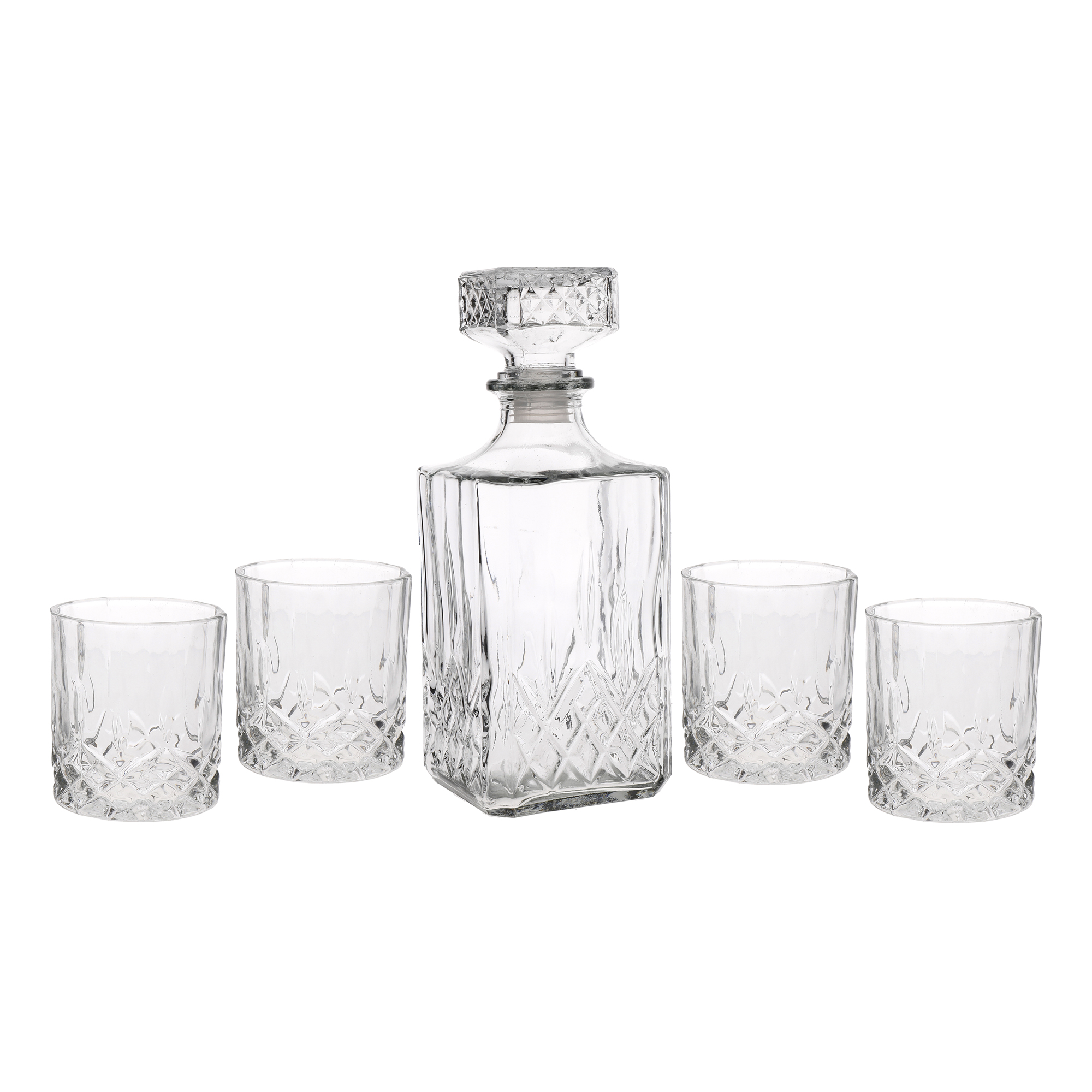Комплектът от 5 части включва стъклен декантер с вместимост 900 мл, повече от достатъчно, за да побере стандартна бутилка скоч от 700 мл. Разполага с плътно прилепваща силиконова запушалка, за да запази свойствата на напитката. Комплектът включва и 4 чаши с вместимост 200 мл всяка, изработени от висококачествено стъкло и декорирани в традиционен стил.