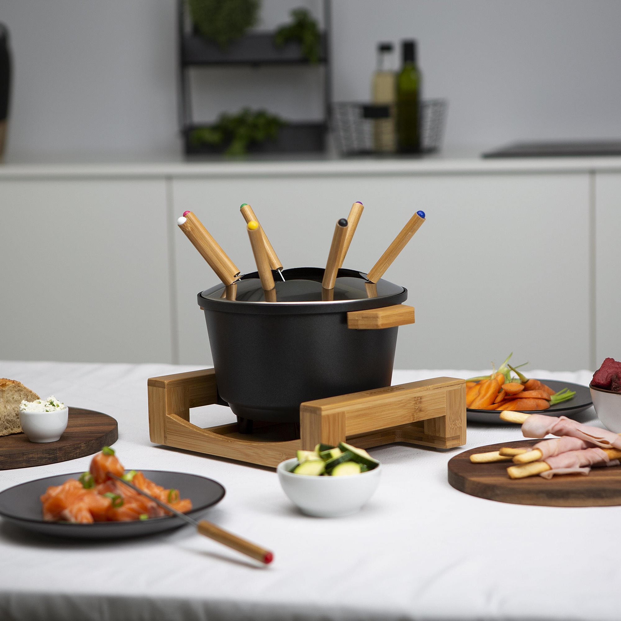 Дизайнът на електрическия комплект фондю със сигурност ще привлече всички погледи към него, съчетавайки елементи от лят алуминий с бамбуково дърво - издръжлив и качествен материал. Бамбуковият държач предлага и други предимства, освен естетическите, оставайки на ниска температура по време на употреба, така че да можете лесно да боравите с комплекта.