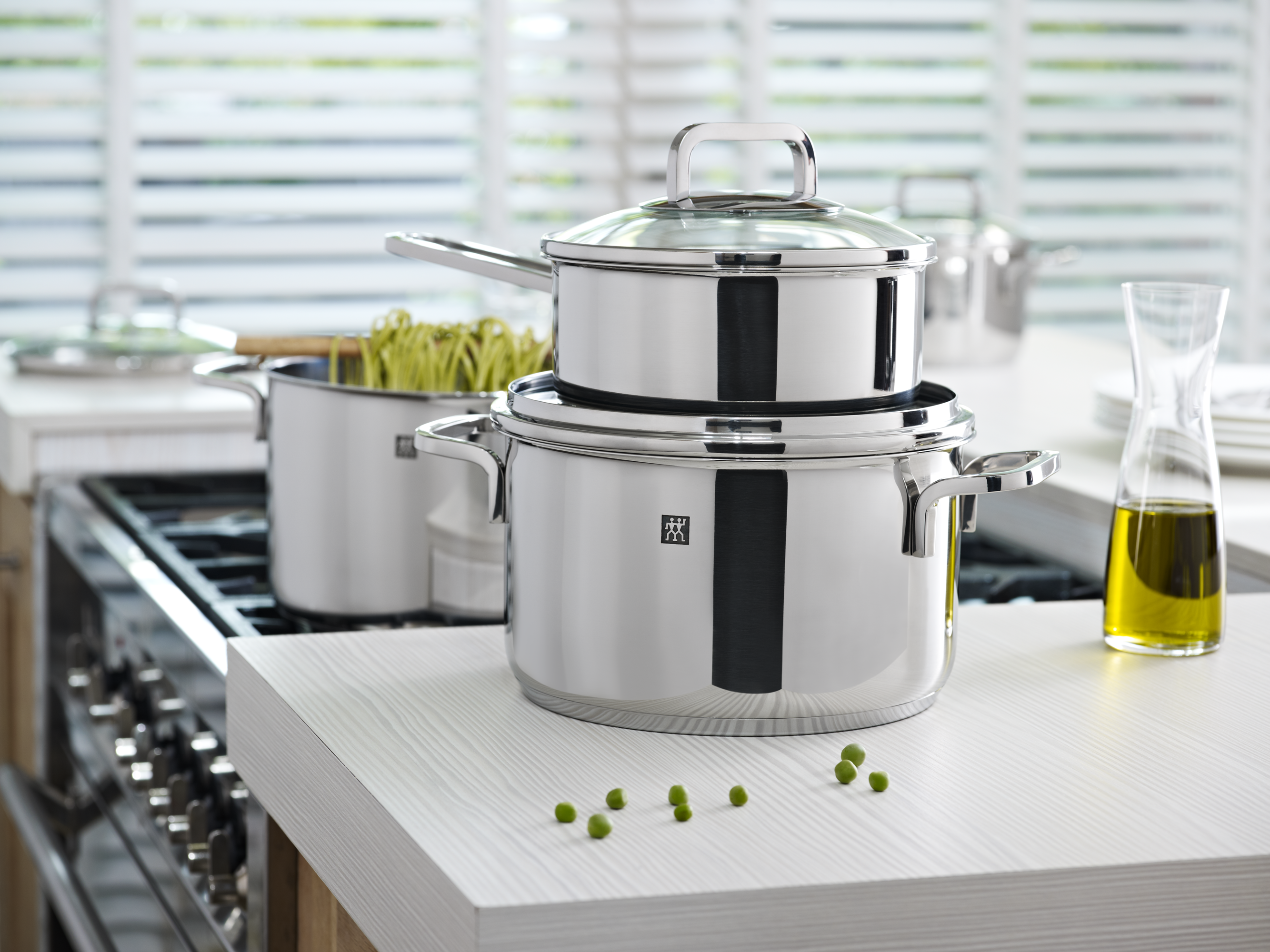 Готварските съдове имат дръжки от неръждаема стомана и ръбовете имат внимателно проучен дизайн, за прецизен поток от течности. Капаките са направени от термоустойчиво стъкло и са снабдени с дръжки от неръждаема стомана.