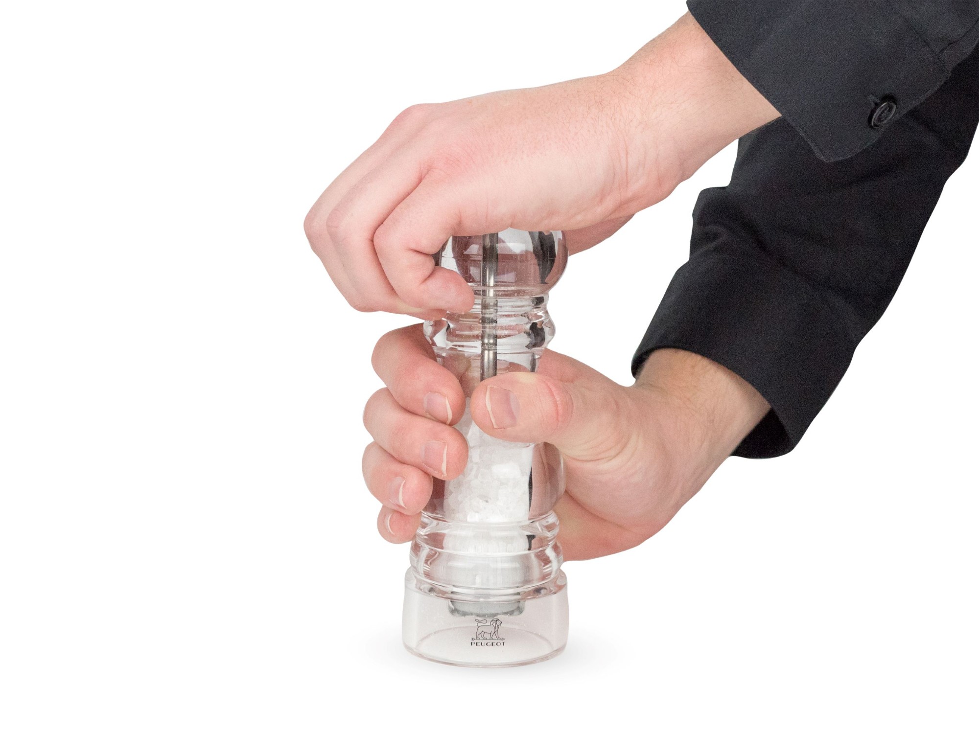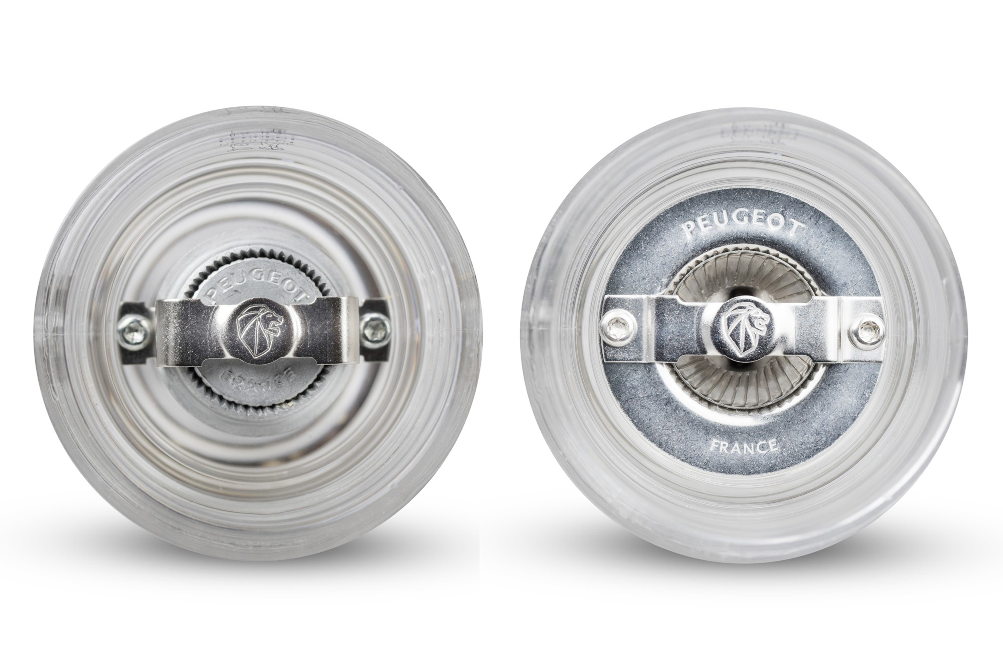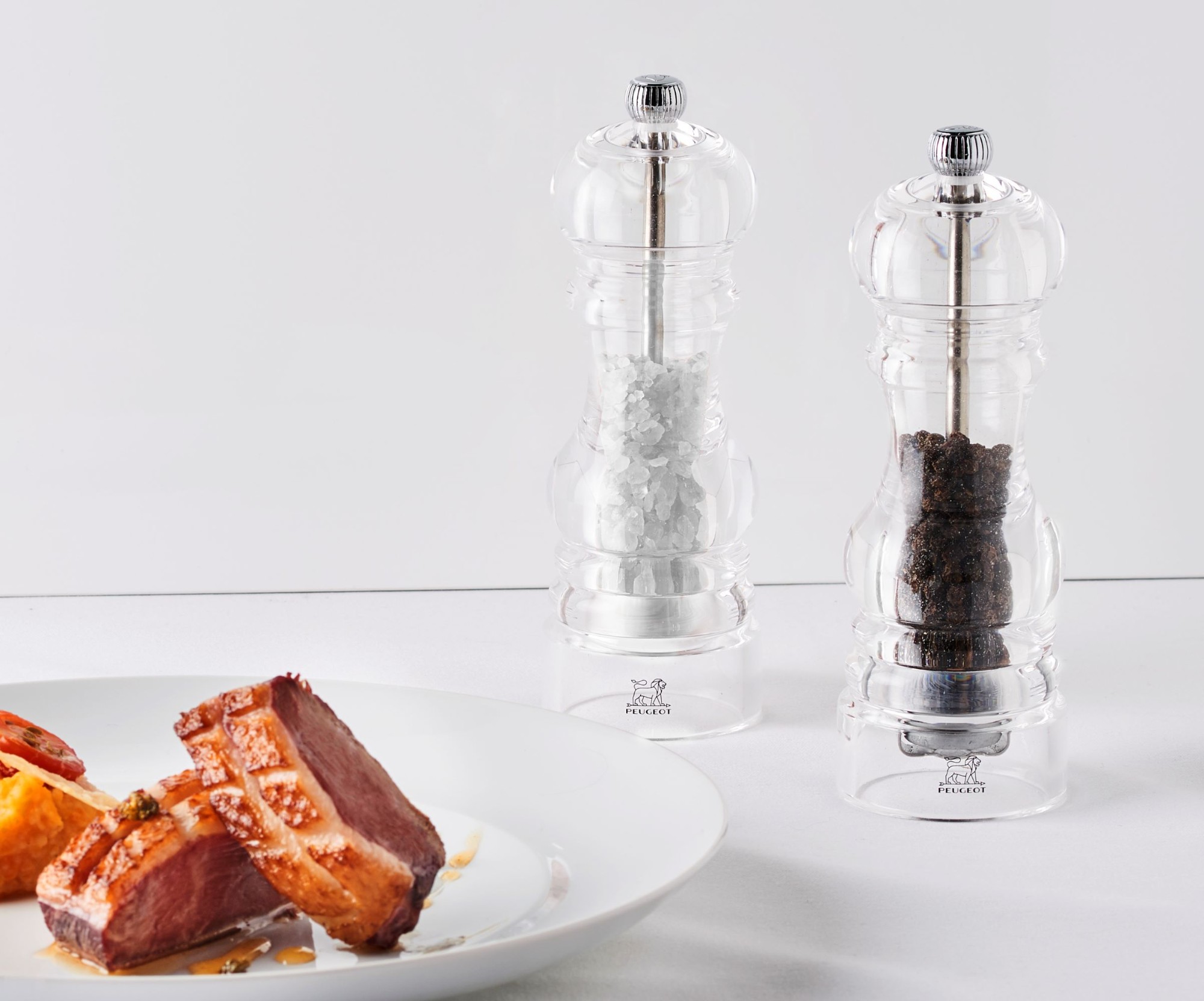 Комплект от 2 броя мелнички за сол и черен пипер, и двете с височина 18 см, изработени от акрил, марка Peugeot.