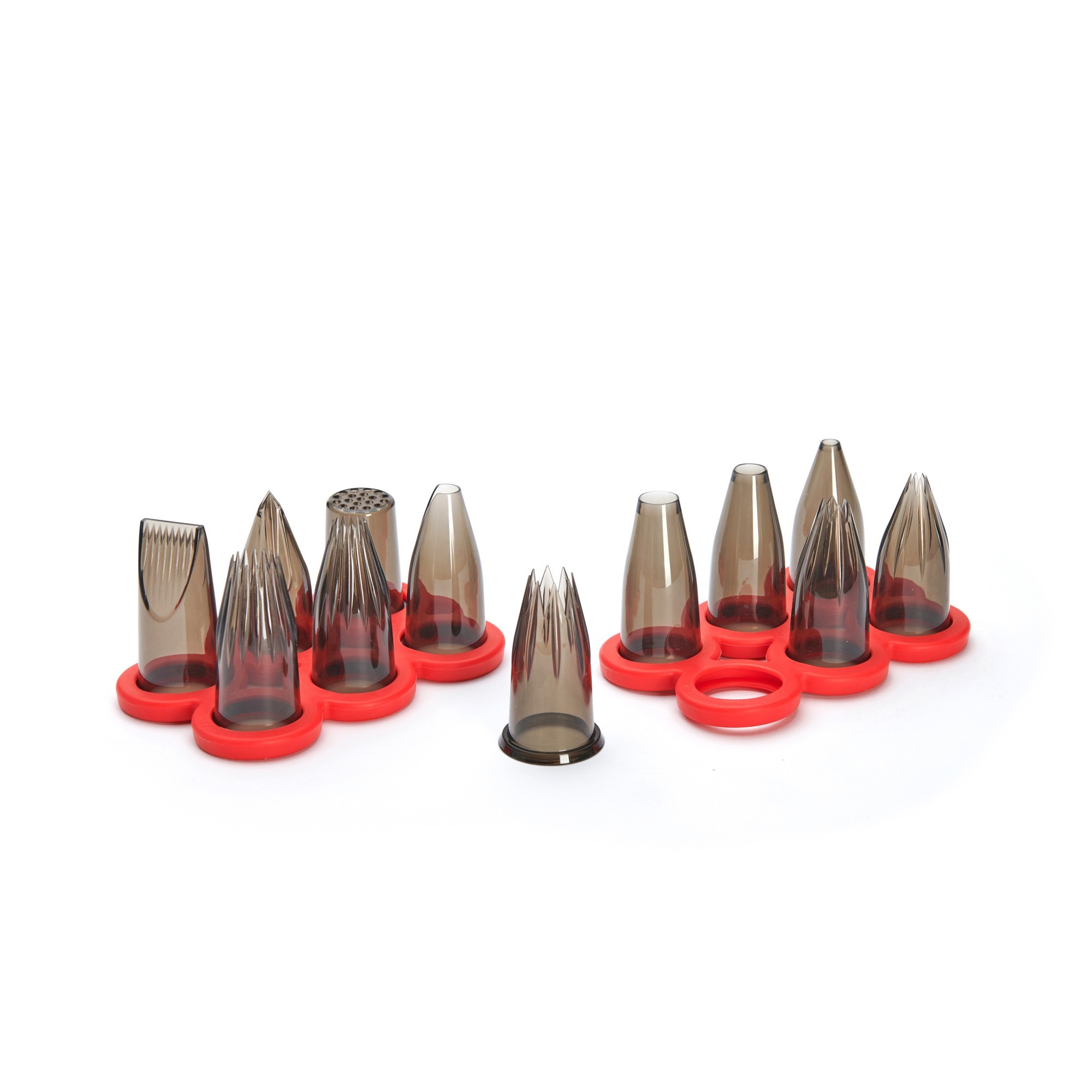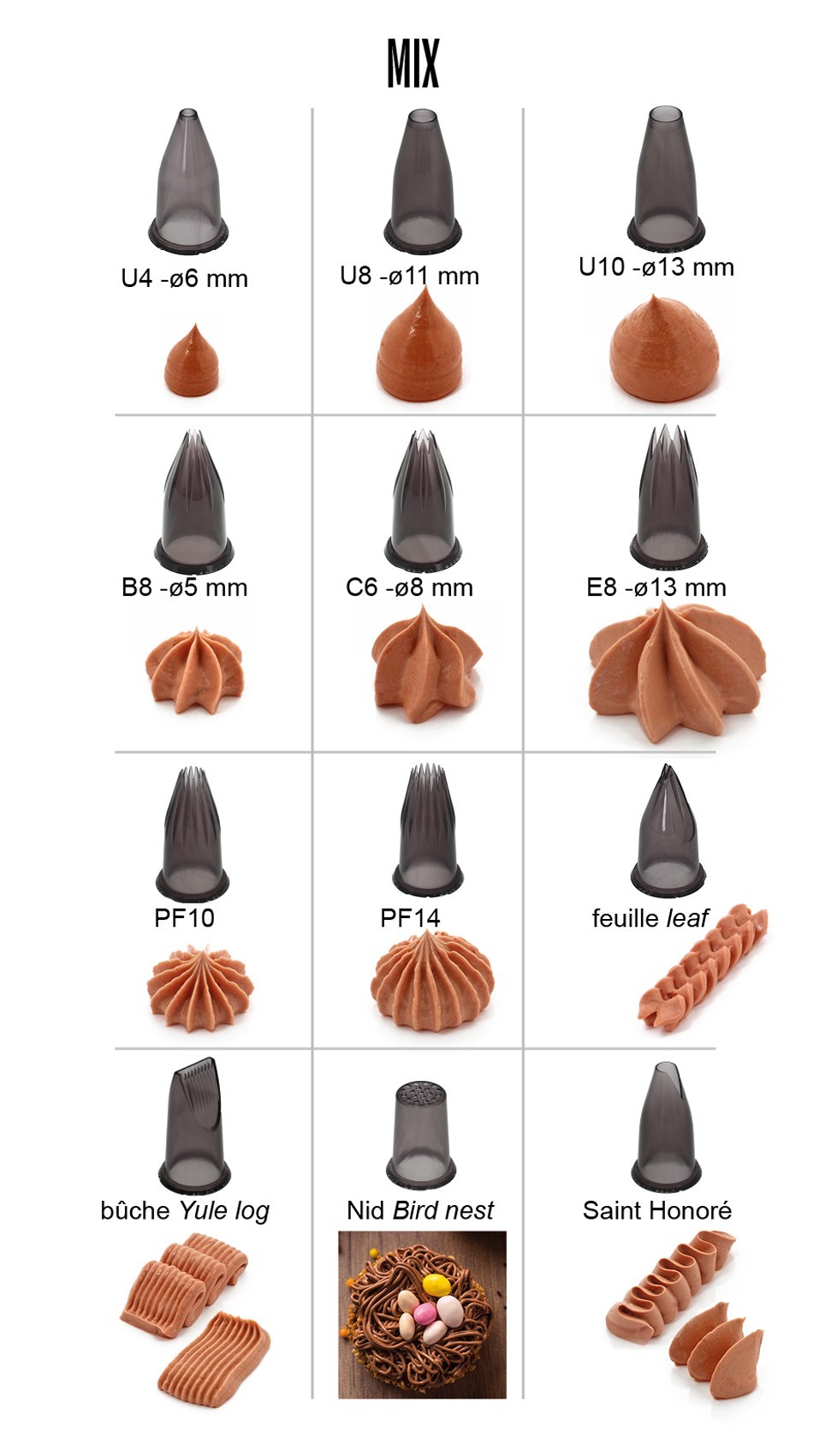 Комплектът включва следните дюзи: U4 (6 mm), U8 (11 mm), U10 (13 mm), B8 (5 mm), C6 (8 mm), E8 (13 mm), PF10, PF14, FE2, BU8, 1 дюза за гнездо за птици, 1 дюза Saint Honoré 9 мм.