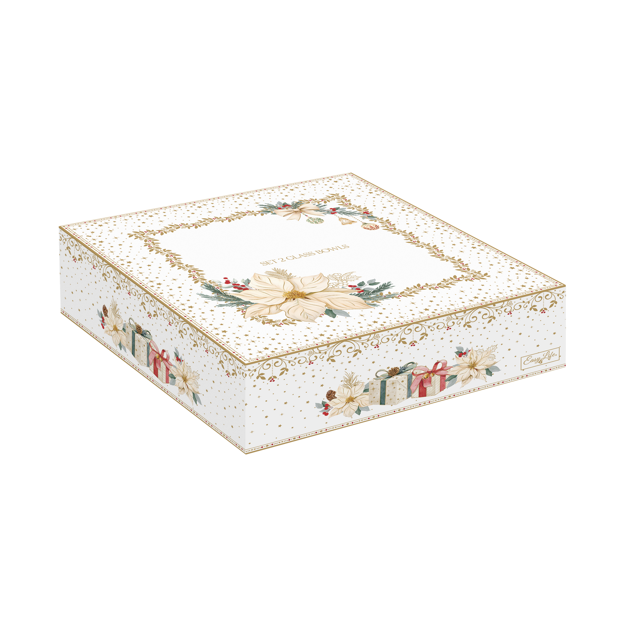 Златните стъклени купички, с различни диаметри - марка Nuova R2S - оформени и внимателно декорирани, за да представят символичното коледно цвете, са наистина елегантни и ще внесат блясък на вашите празнични трапези. Купичките могат да се комбинират с други съдове от колекцията White Elegance или други празнични колекции Nuova R2S.