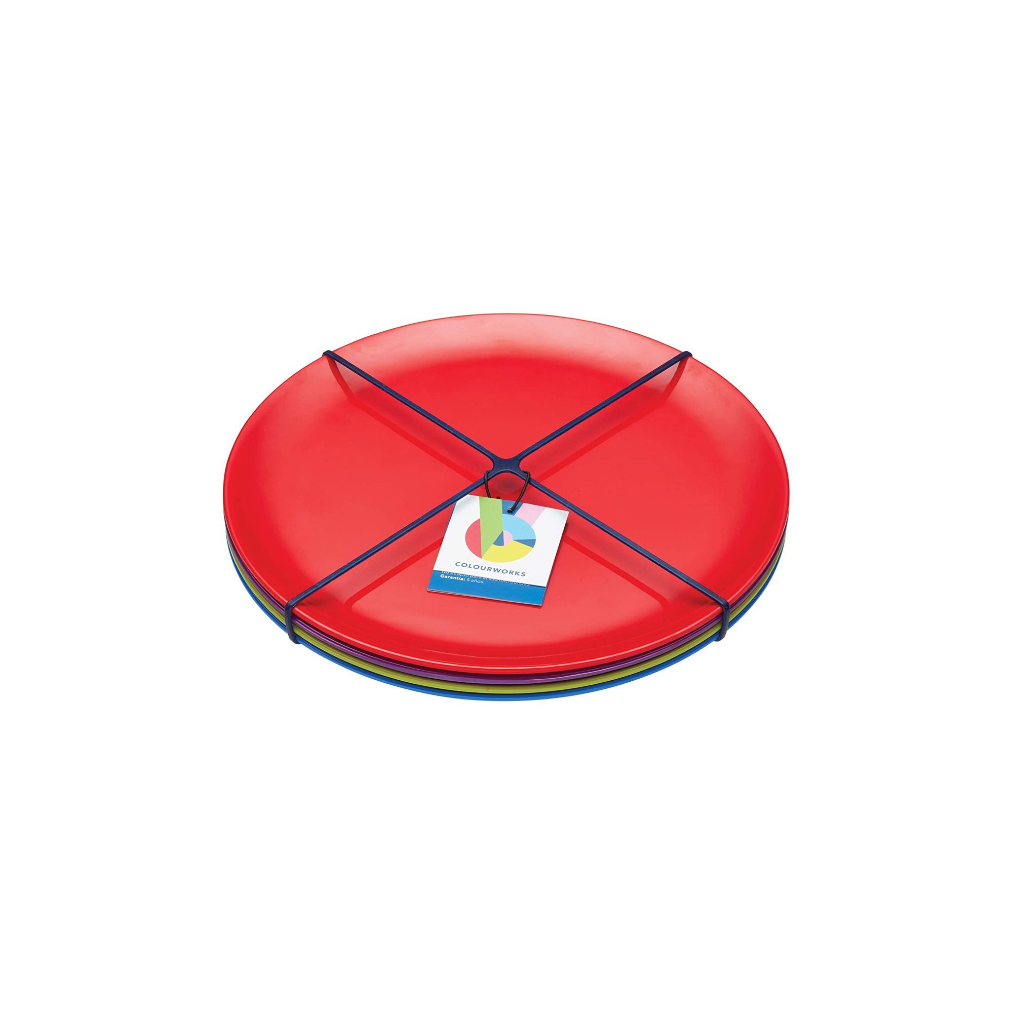 Комплект от 4 чинии, марка Colourworks, направени от меламин, диаметър 23 см, всеки продукт оцветен по различен начин, идеален за сервиране на салата. Те са високоустойчиви, почти неразрушими, като са идеални за пикници и ястия на открито.