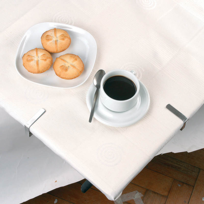 Комплект от 4 скоби за покривки, от марката Kitchen Craft, изработена от неръждаема стомана. С тези регулируеми скоби можете да си осигурите всяка покривка, независимо от размерите й. Таблицата може да е максимална с дебелина 3-см.