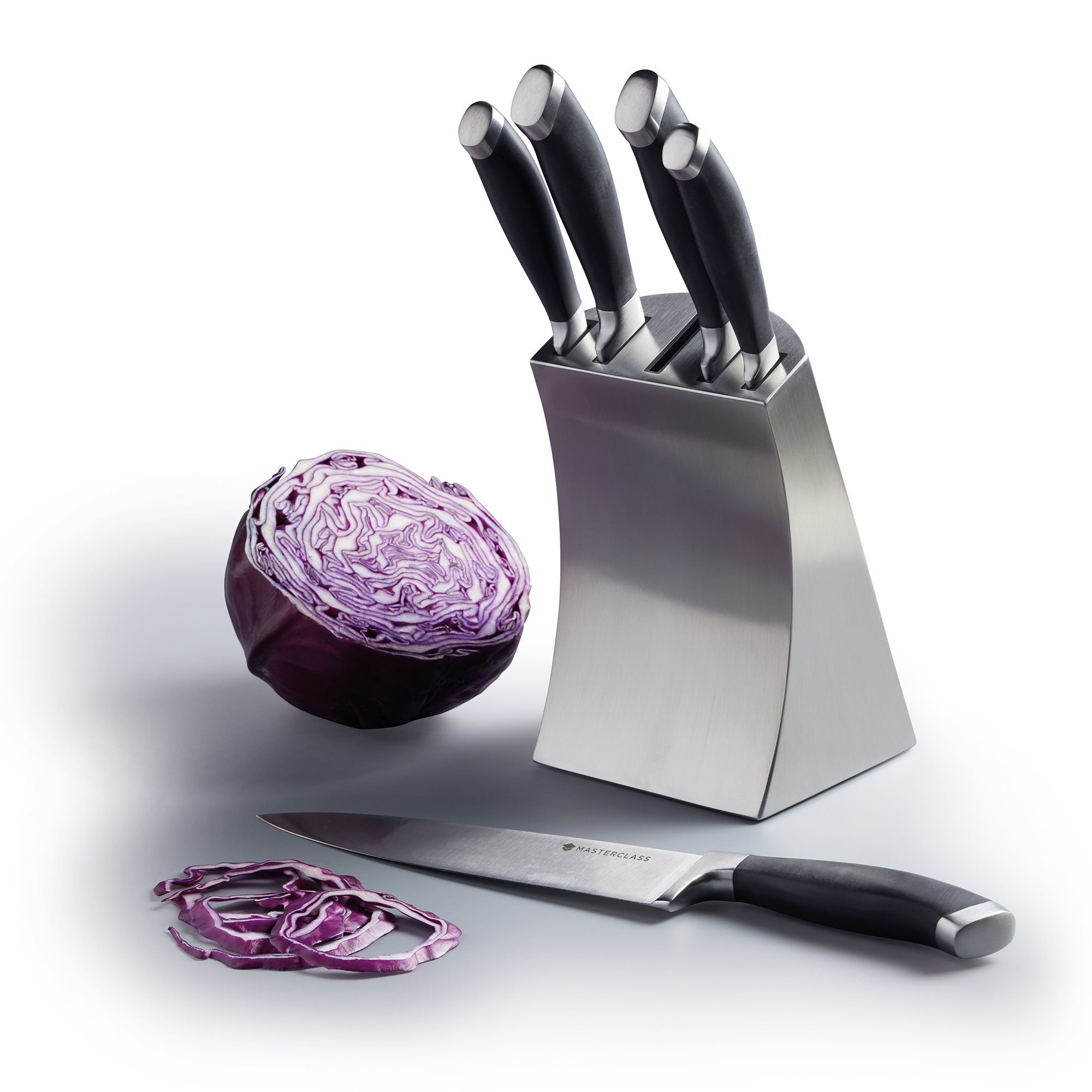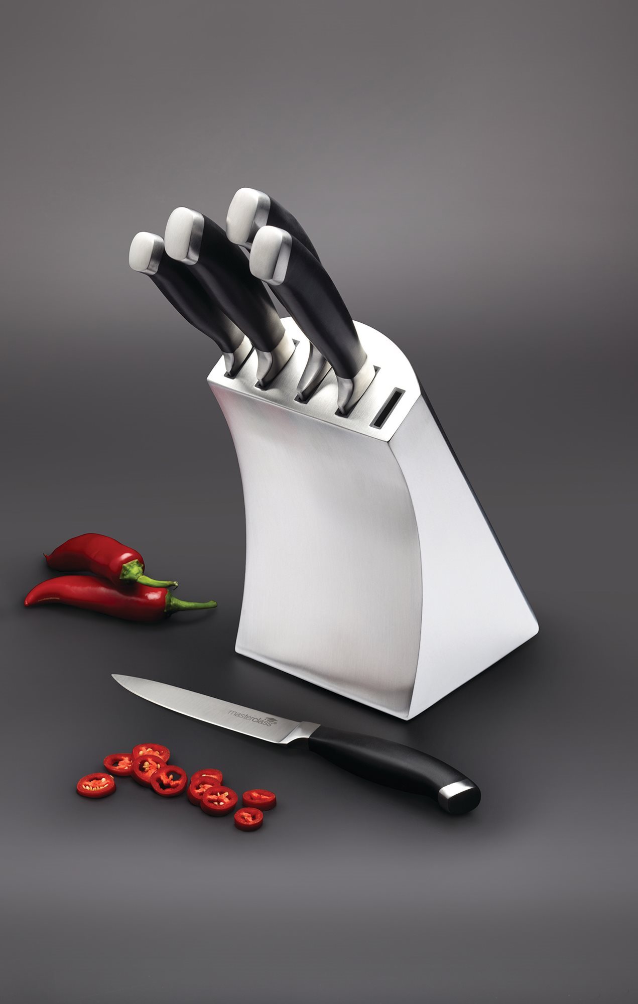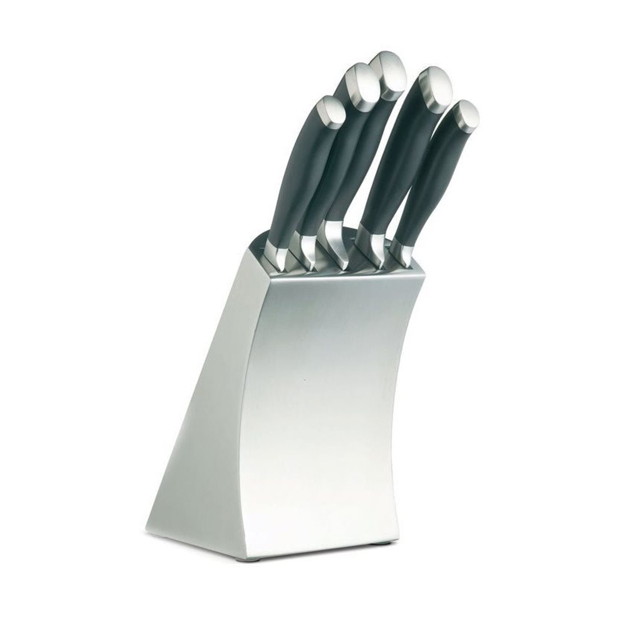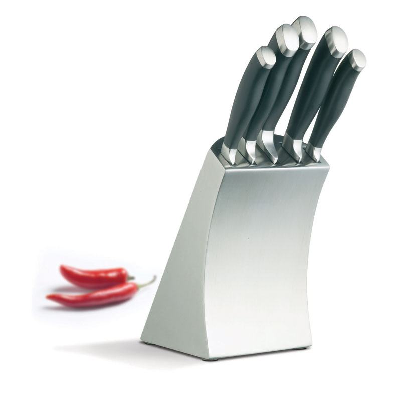 Специалният държач от неръждаема стомана придава елегантност и стабилност, като тези точно заточени ножове са абсолютно необходими във всяка кухня.