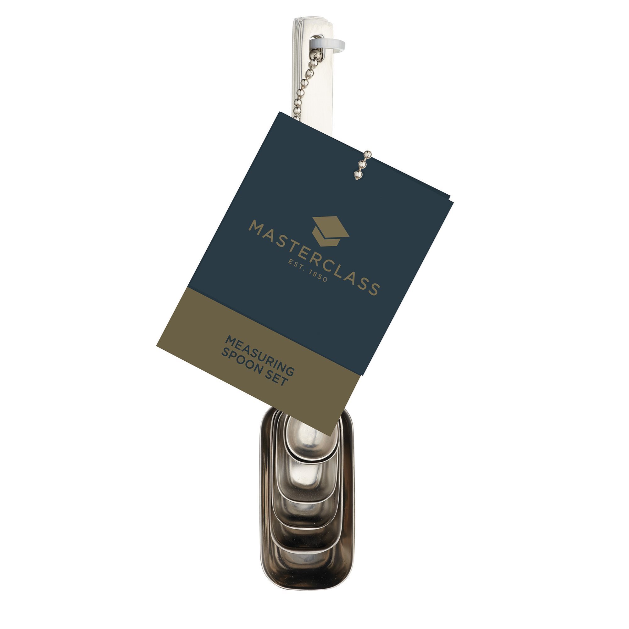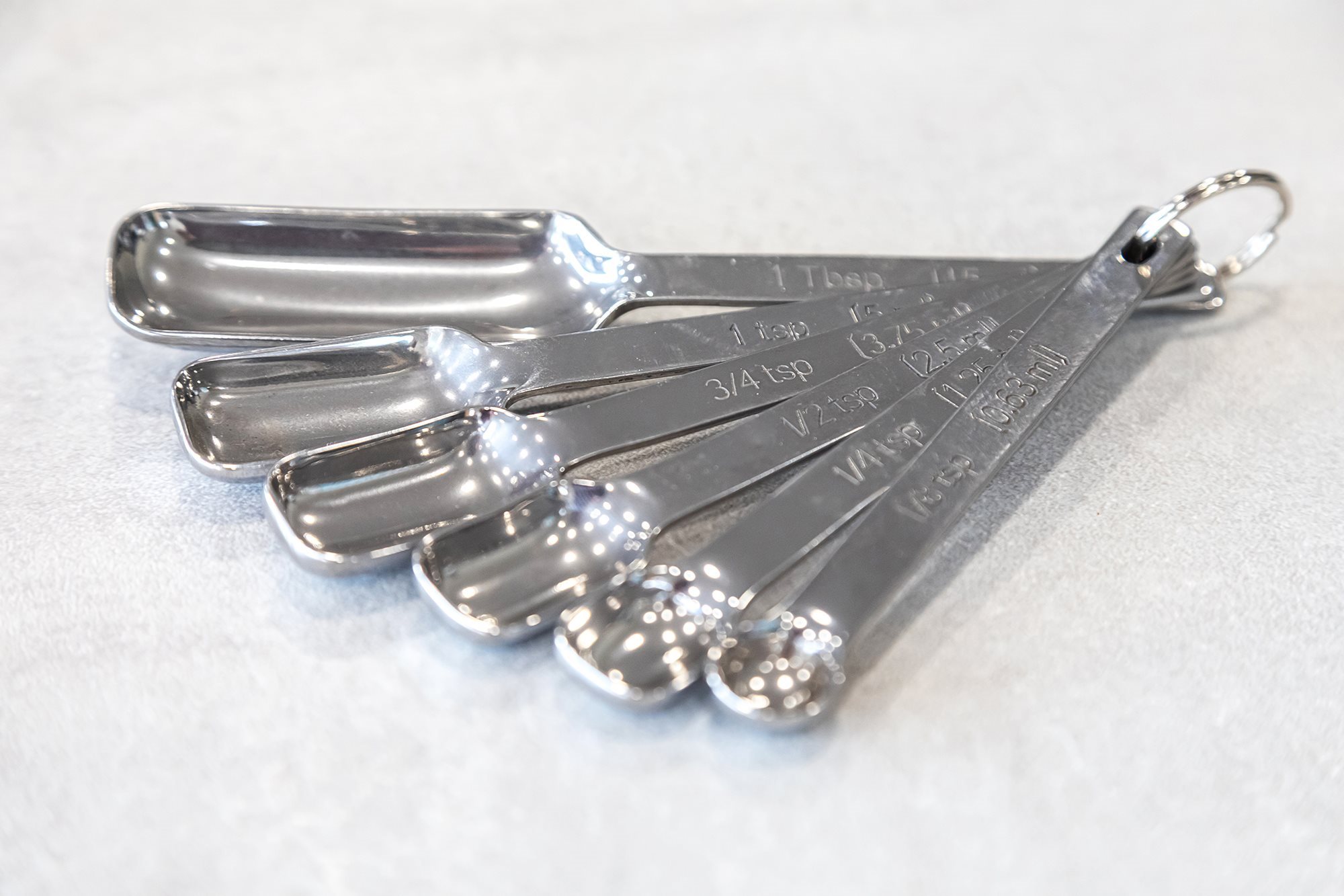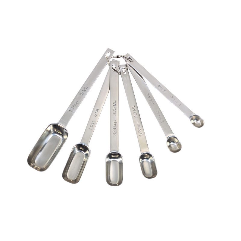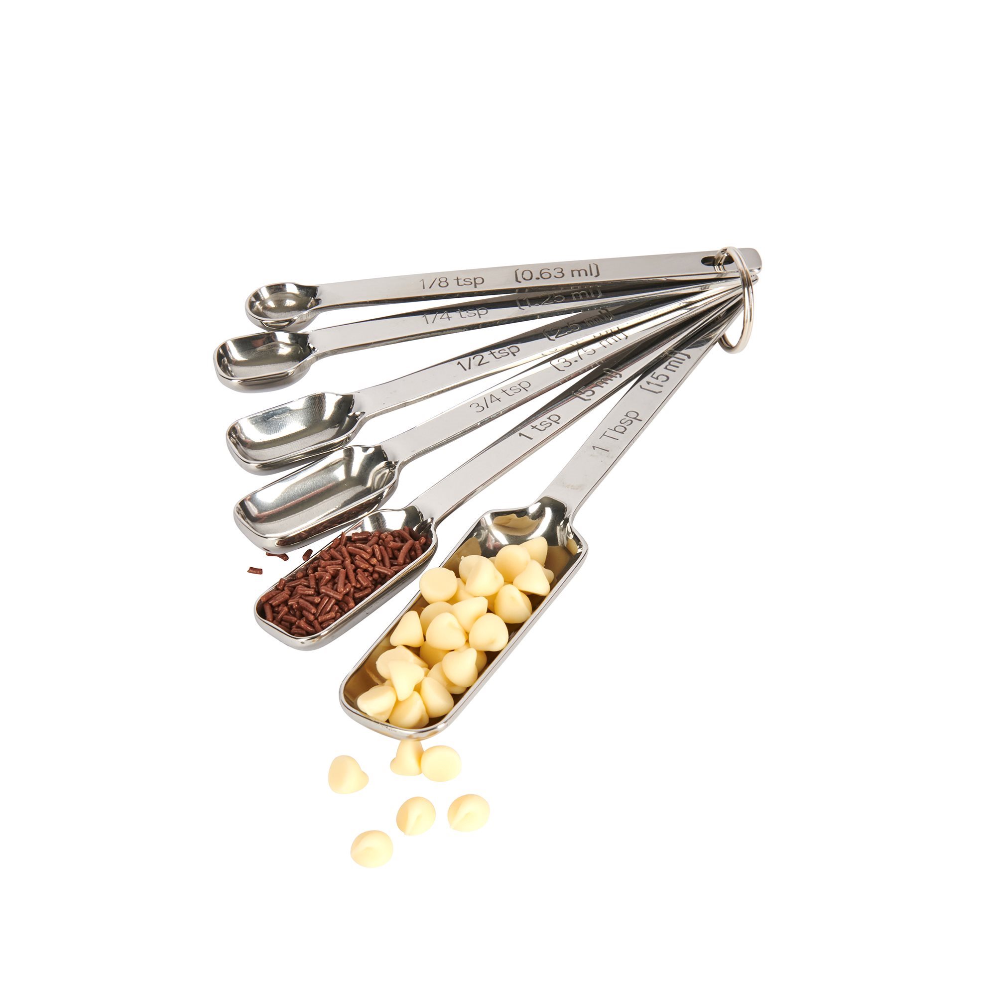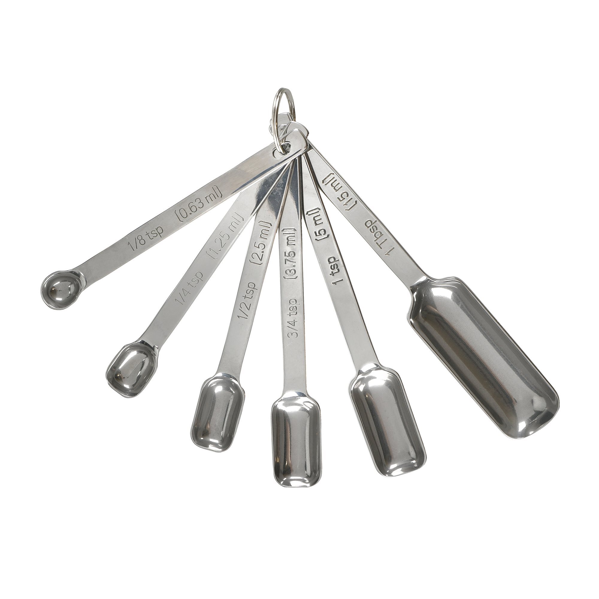 Комплект от мерителни лъжици, марка Kitchen Craft, всички направени от неръждаема стомана. Комплектът включва 6 супени лъжици с мерни единици като чаена лъжичка (tsp), супена лъжица (Tbs) и мл.