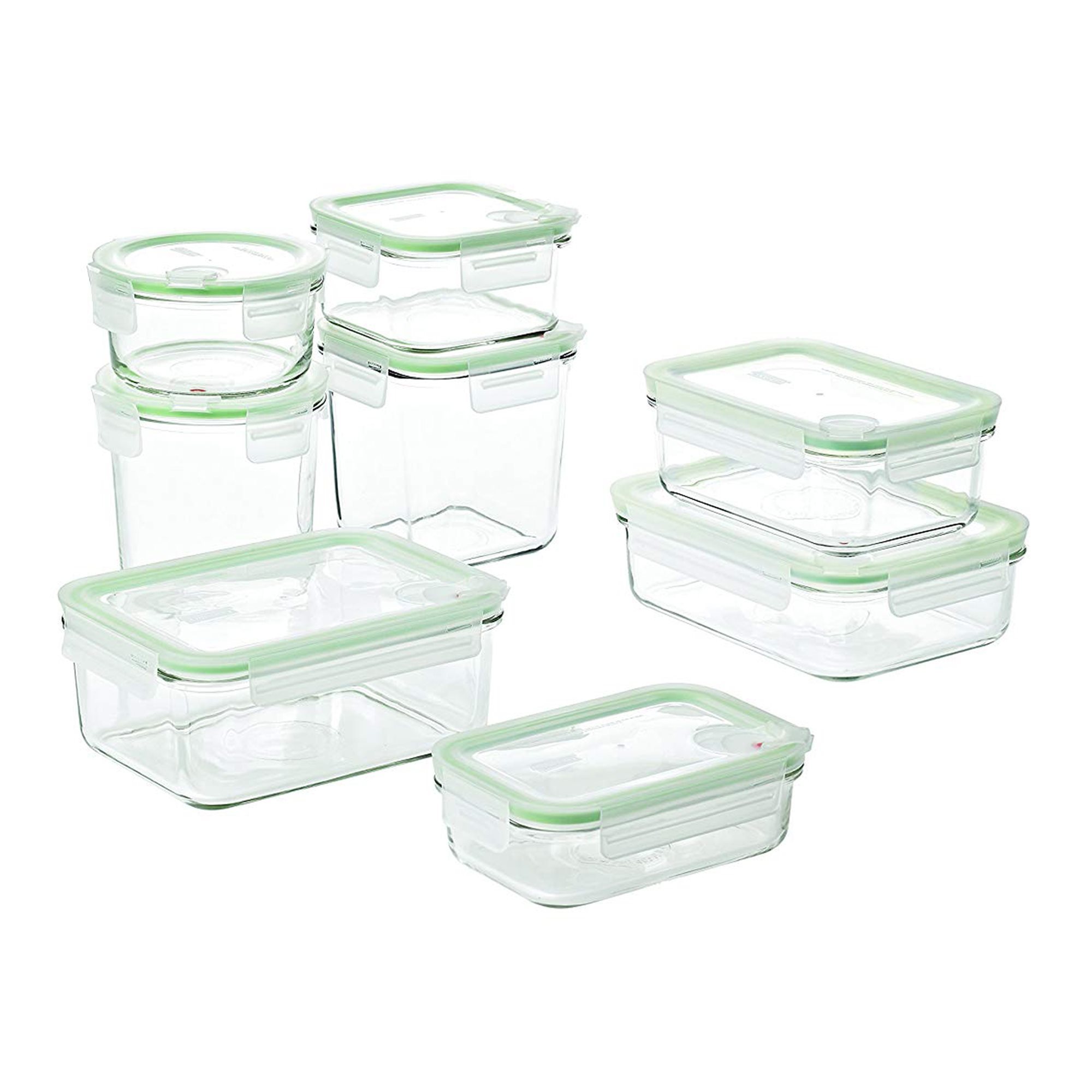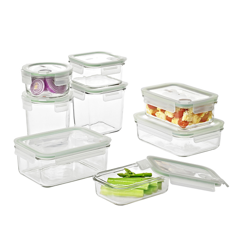 Комплект от 8 контейнери за съхранение на храни с марка Glasslock, изработени от специално обработено стъкло, с капак, устойчиви на температури между -20 и +120 °C.