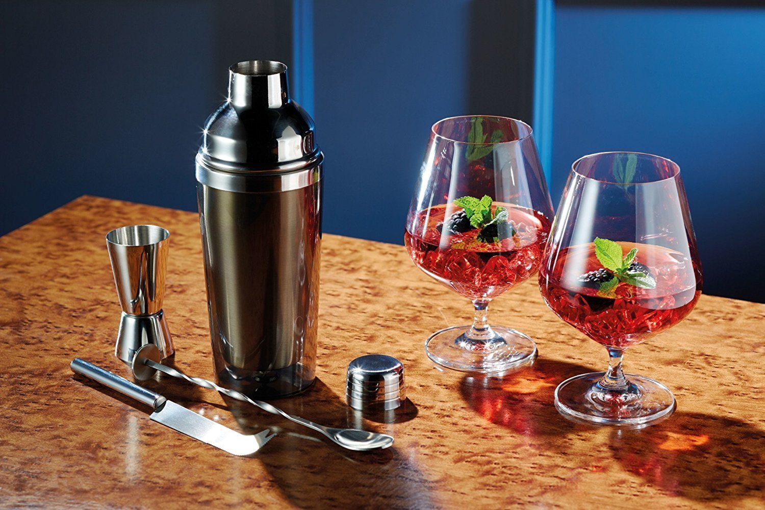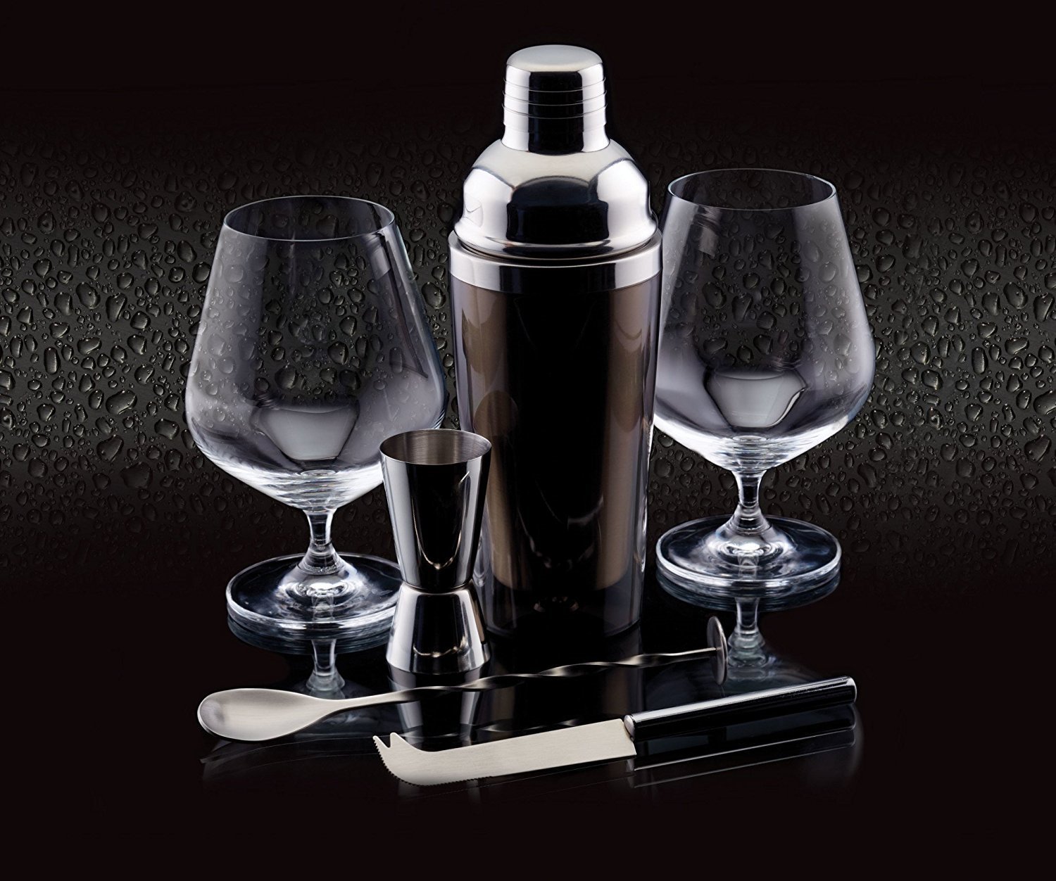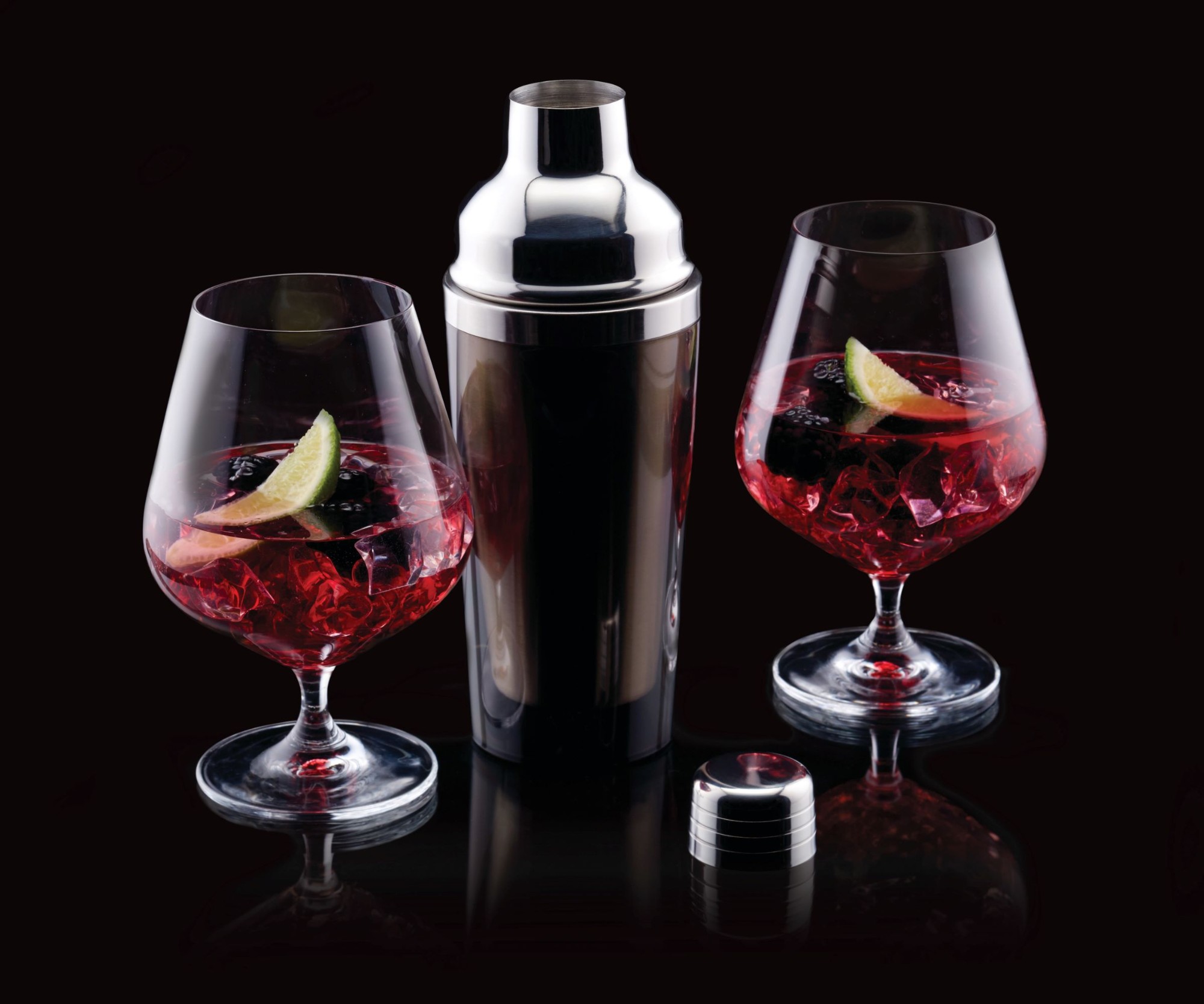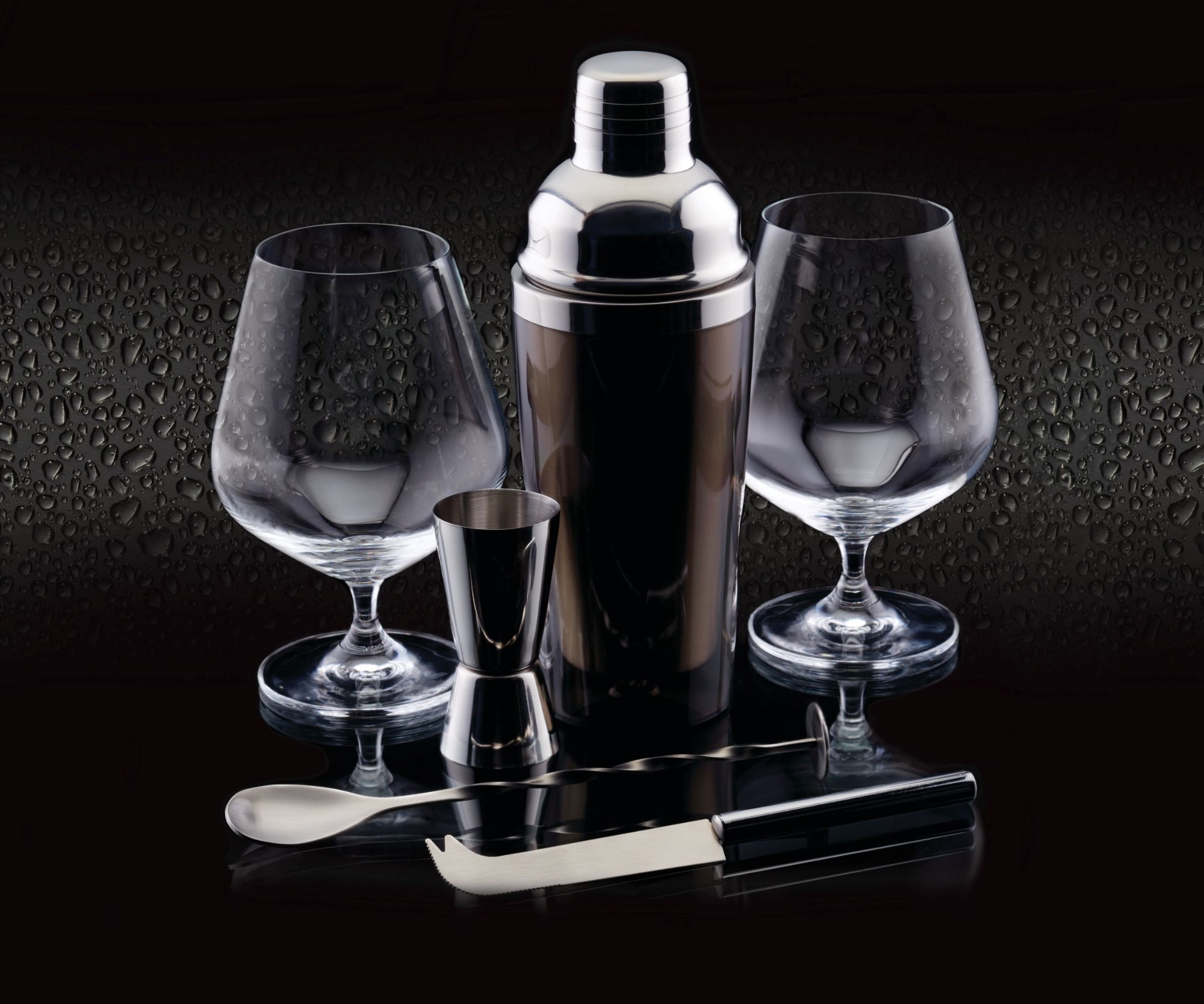 Комплектът включва шейкър от неръждаема стомана от 400 ml, двойна чаша за измерване от неръждаема стомана, коктейлна лъжица от неръждаема стомана, бар нож от неръждаема стомана, книжка с рецепти за коктейли и две чаши за сух джин с вместимост 600 ml всяка.