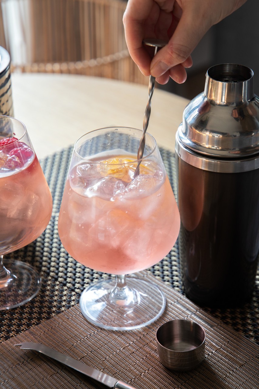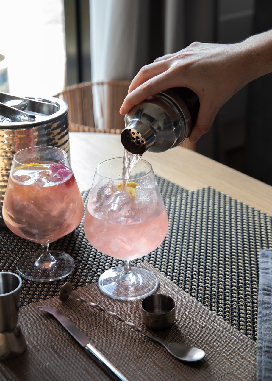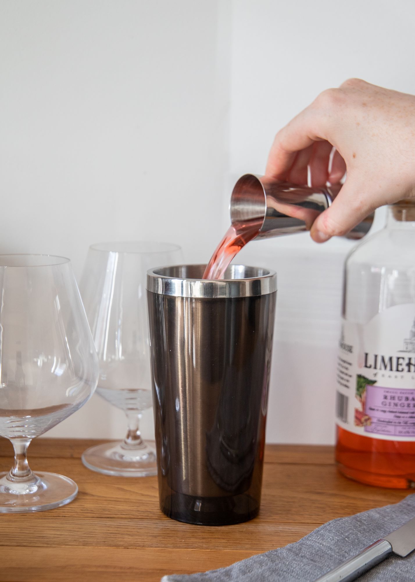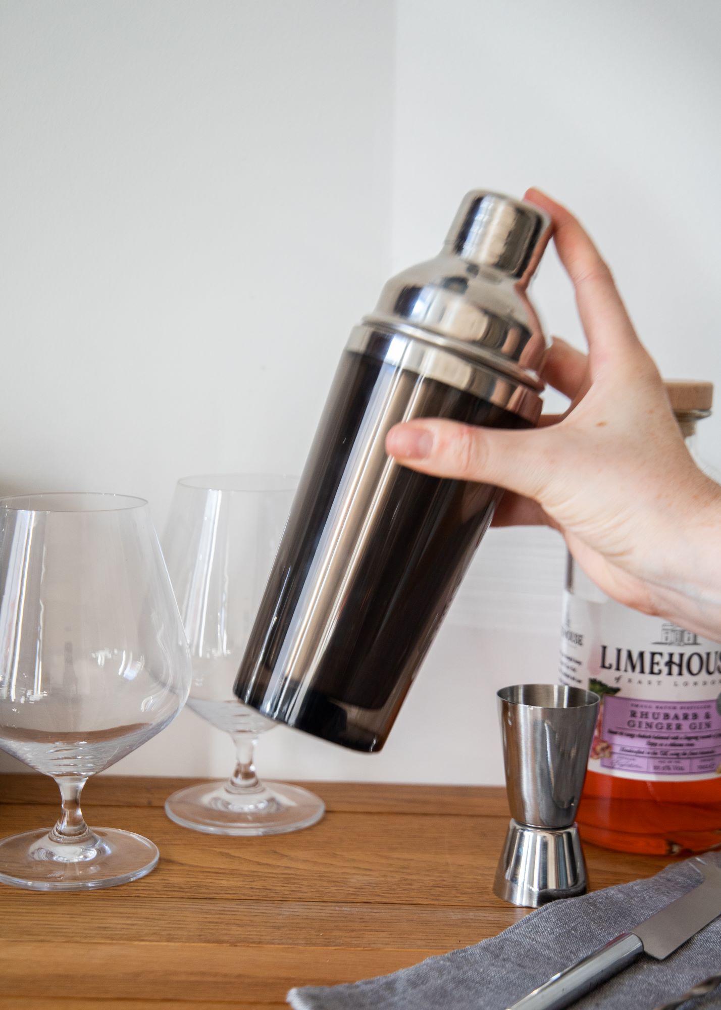 Комплектът включва шейкър от неръждаема стомана от 400 ml, двойна чаша за измерване от неръждаема стомана, коктейлна лъжица от неръждаема стомана, бар нож от неръждаема стомана, книжка с рецепти за коктейли и две чаши за сух джин с вместимост 600 ml всяка.