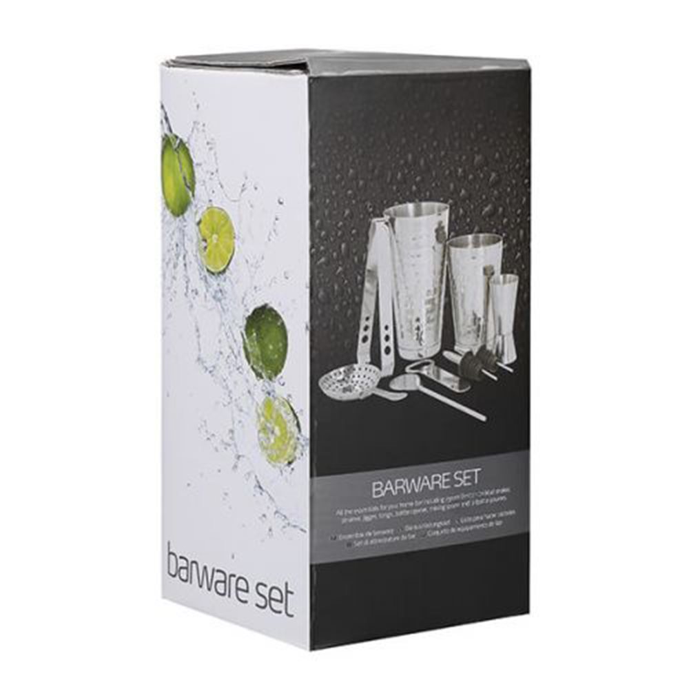 Комплектът включва шейкър за коктейли тип „Бостън“ с обем 750 мл (предпочитаният избор на професионалните миксолози) и пълен набор от бар инструменти: двойна мерителна чаша (25/50 мл), отварачка за бутилки, лъжица за смесване, щипки за лед, цедка и две наливачки със силиконови уплътнения.